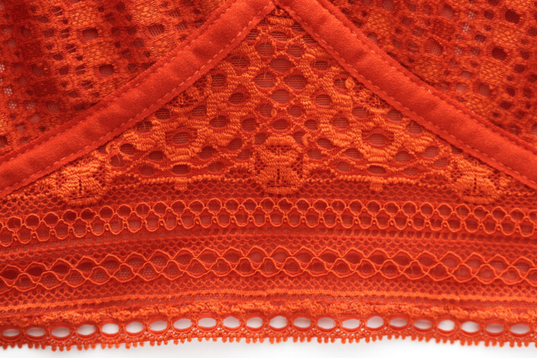 W bokach nie ma żadnych usztywnień. Jedynym trochę stabilniejszym punktem Zary jest jej zapięcie, które jest sztywne i nie zwija się (i przy tym jest miłe w dotyku). „Ramiączka” to po prostu zszyte ze sobą szczyt miseczki oraz trójkąt z elastycznej koronki z tyłu. Jak widzicie, większość biustonosza jest od spodu podszyta dodatkową warstwą materiału – jest to elastyczny, fajnie pracujący tiul.