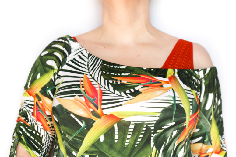 Na zdjęciach ubranych mam na sobie bluzkę firmy Urkye – Francuzka 3/4, w rozmiarze 46 o/oo, czyli 46, dla biustów „standardowo-większych” 🙂 (w ofercie jest też jeszcze większy rozmiar biustowy – oo/ooo). To też rozmiar „podwójny”, stosowany przez Urkye dla ubrań elastycznych. Ubrania z tkanin mają trzy rozmiary biustu: o, oo oraz ooo.