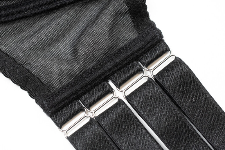 A skoro już o podtrzymaniu mowa – jest bardzo dobre, Blackbra to jednak zupełnie inna bajka niż bielizna erotyczna tworzona bez myśli o podtrzymaniu cięższego biustu. Trzyma jak każdy porządny stanik, a obwód wręcz bardzo mocno, bo gumki są aż cztery i bynajmniej nie bardzo rozciągliwe. Na szczęście jest regulacja 😉 Ramiączka są w przedniej części dodatkowo wzmocnione od spodu (guma jest złożona na pół i zszyta), dzięki czemu są całkiem pancerne, mimo że niezbyt szerokie. Nie żałowano tu mocnej gumy, to na pewno!