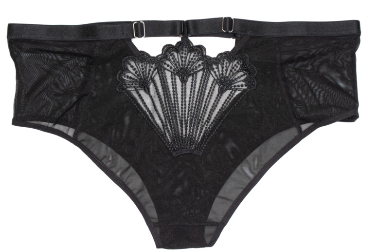 Dzieje się tu dużo, mocno i ze smakiem, zarówno z przodu, jak i z tyłu. Z przodu pierwsze skrzypce grają oczywiście wstawki z haftu z wachlarzowato-koralikowymi motywami, które kojarzą się nieco art-decowsko. Wiem, jakim wyzwaniem było stworzenie tej konstrukcji tak, by hafty się nie naciągały i nie marszczyły, bo są nieelastyczne (w przeciwieństwie do paseczków, na których są zamocowane, które są gumkami). Uspokajam, że są świetnej jakości, solidnie wykończone, nie siepią się, choć nie wkładałabym ich do pralki 😉 No i są piękne!
