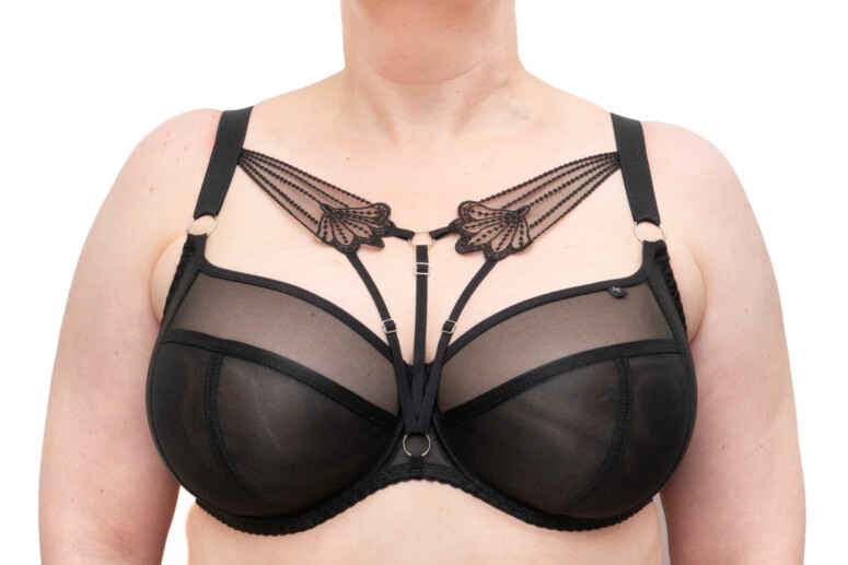 Orchidea ma, podobnie jak inne miękkie biustonosze Blackbra, konstrukcję side-support, która zwykle dobrze się sprawdza w rozmiarach plus sajzowych. Oznacza to czteroczęściową miseczkę z panelem bocznym. Jest on spory, z podwójnej warstwy tiulu. Miseczki nie są mocno zabudowane, jak przystało na model będący częścią seksownego setu, ale głębokie. Fiszbiny określiłabym jako w normie szerokościowej, nie są za wąskie, ale też i nie tak szerokie, jak np. w marce Elomi, która jest moim ulubionym punktem odniesienia jeśli chodzi o bieliznę plus size. Dobrze, że są odchylone na boki, dzięki czemu mnie nie cisną.