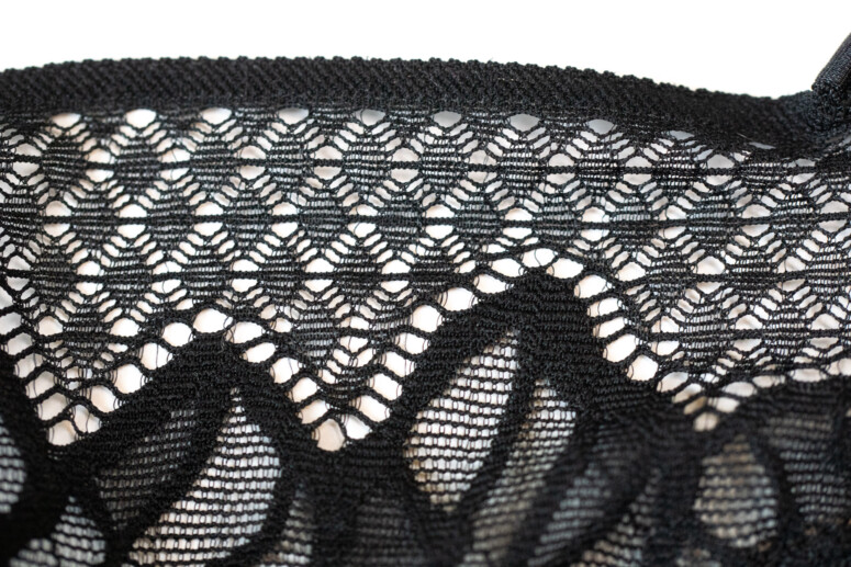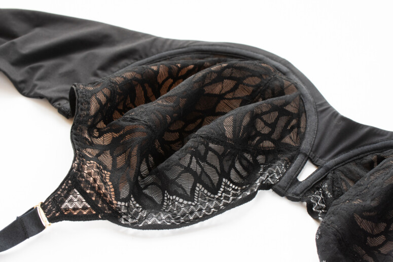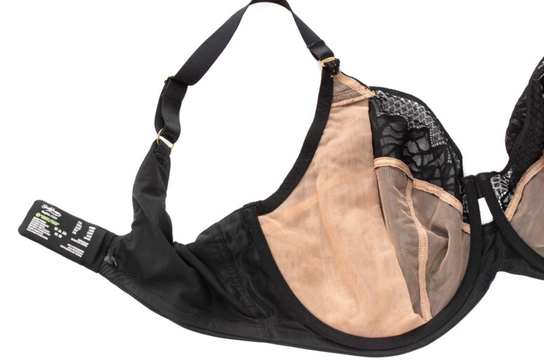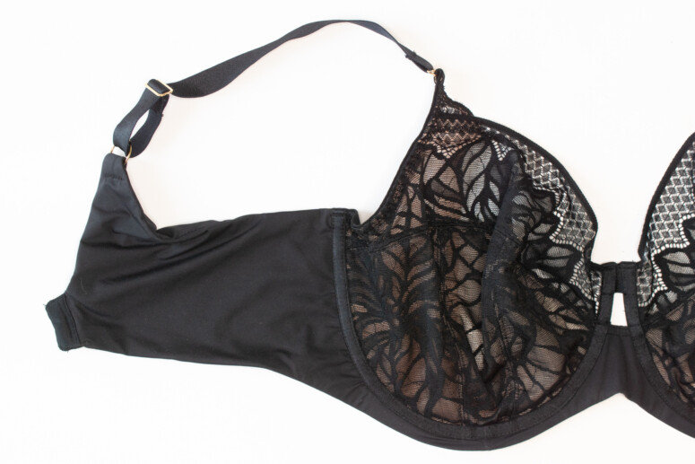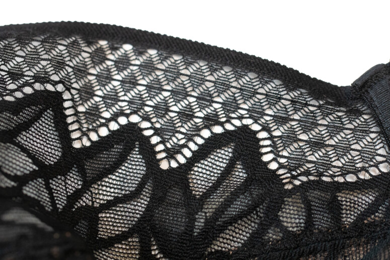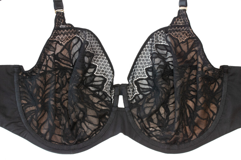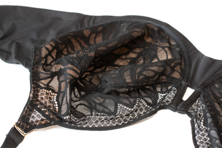 Te „firanki” z boków są również z nieelastycznego materiału – sprawiają, że konstrukcja wygląda jak side-supportowa, i choć w istocie nią nie jest, to… trochę nią jest. Dzięki tym dużym panelom całość jest dużo stabilniejsza i to one sprawiają, że rozciągliwa koronka może robić swoją subtelną robotę. Jest to naprawdę świetnie pomyślane. Co ważne, nie ma tutaj żadnych zauważalnych różnic w wyglądzie między częściami biustu ustabilizowanymi przez dół i boki, a tą częścią piersi, która oddycha w elastycznej koronce – żadnych widocznych granic (a zdarzało mi się takie zjawiska obserwować w innych modelach). Po tym poznaje się mistrzostwo leżące nie tylko w samej konstrukcji, ale i doborze materiałów, które muszą ze sobą współgrać.