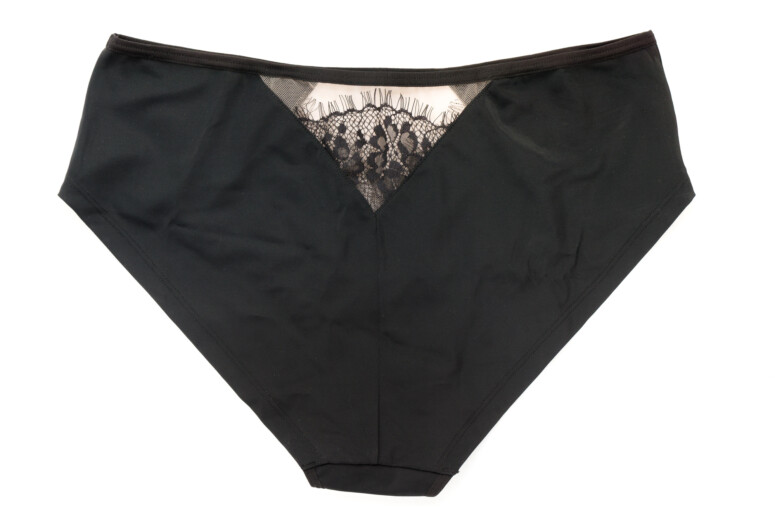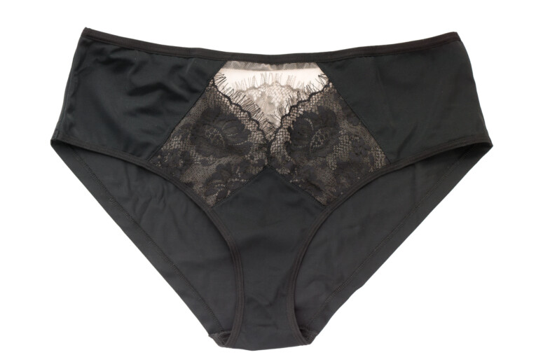 Zaletą gatek jest to, że wreszcie dostałam w nich te duże kwiaty na koronce 😉 i rzęski na jej brzegach zarówno z przodu, jak i z tyłu. Są to zupełnie wygodne figi z elastycznej dzianiny z tiulowo-koronkowymi wstawkami. Wizualnie raczej proste, może nawet za bardzo, i trochę przeszkadza mi wielkość tego tiulowego okna u góry – nie koresponduje za bardzo ze stanikiem i wolałabym, żeby lekkość wizualną osiągnięto tu na przykład przez zastosowanie czarnego elastycznego tiulu zamiast kryjącej dzianiny. Ale dobrze, że coś się dzieje z obu stron. Są średniozabudowane, mogłyby być odrobinę wyższe.