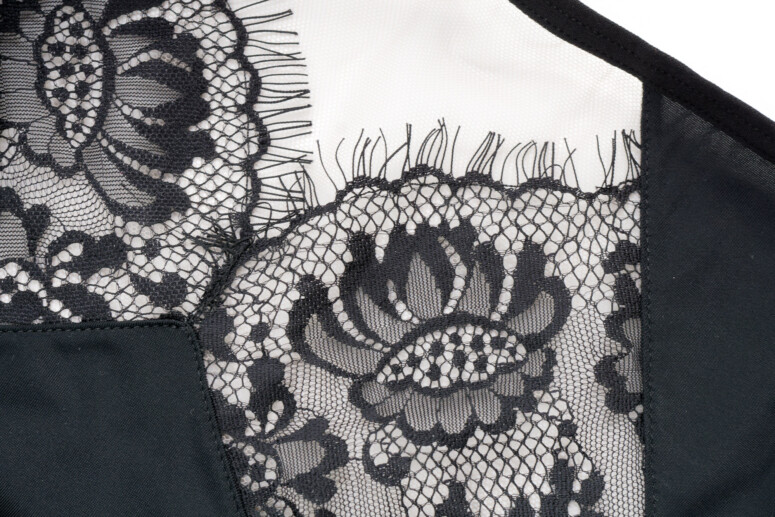 Koronka w górnej części miseczek jest urodziwa i zawiera rzęski (widać je w pobliżu mostka, a także na figach), ale o jedno mam pretensję – mojemu czarnemu egzemplarzowi trafił się mniej efektowny fragment wzoru (czy też zgoła inny wzór?) niż widzimy na przykład na zdjęciach katalogowych oraz na zielonej próbce, którą dostałam do obfotografowania.