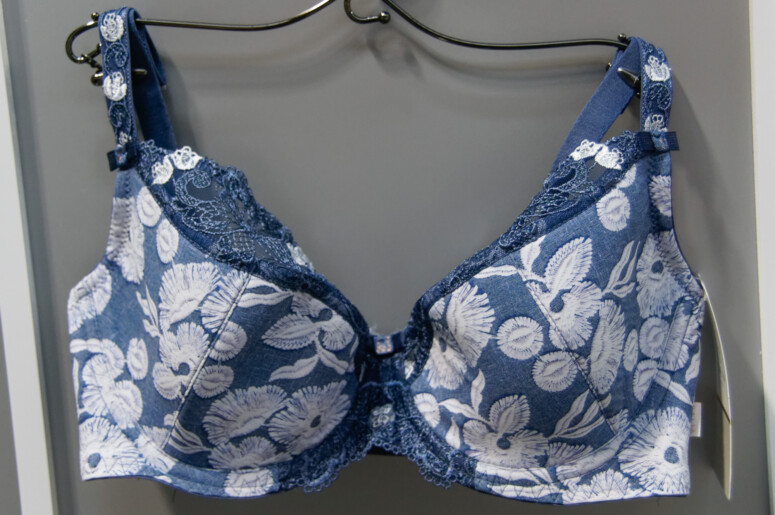 Granatowa, bogato haftowana propozycja Kris Line. Jak zwykle, linia zawiera kilka konstrukcji, w tym widocznego z przodu miękkiego half-cupa o szerokiej rozmiarówce. Zza niego wygląda model o bezszwowych miseczkach (a może to body? Bo też będzie z tym wzorem) oraz zwykły usztywniany.