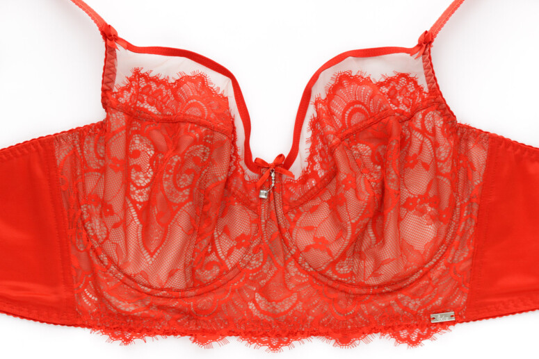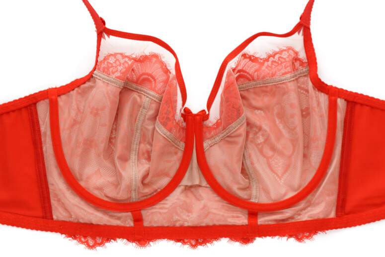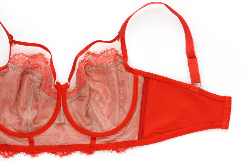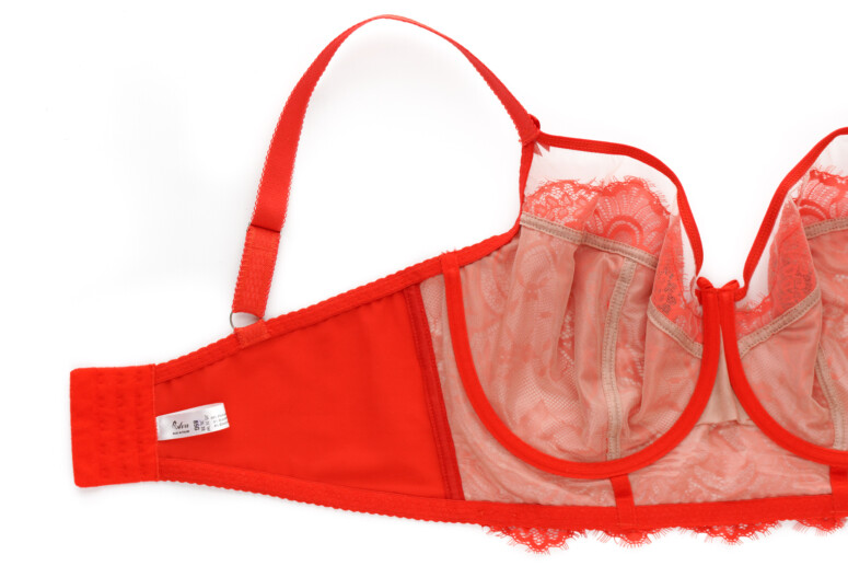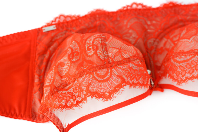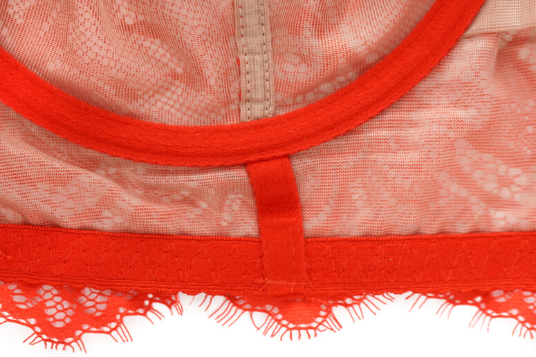 Zachwycam się przede wszystkim efektowną, efekciarską wręcz, jasnoczerwoną koronką na beżowym podkładzie (w niektórych oświetleniach wpada wręcz w koral, co razem z beżem jeszcze tę barwę ociepla – lubi to mój ciepławy typ kolorystyczny), szczególnie w górnej części stanika, tam, gdzie widać rzęskowy brzeg (eyelash lace) i na dolnej krawędzi. Koronki na przodzie są tak wszechobecne i bogate, że nawet nie mam aż takiej pretensji o kompletnie gładki tył. Trochę za to mam pretensję o niesymetryczne rozłożenie wzoru w innych miejscach biustonosza niż górna część miseczek, gdzie udało się to osiągnąć.