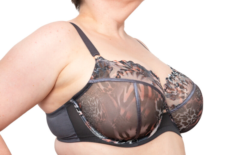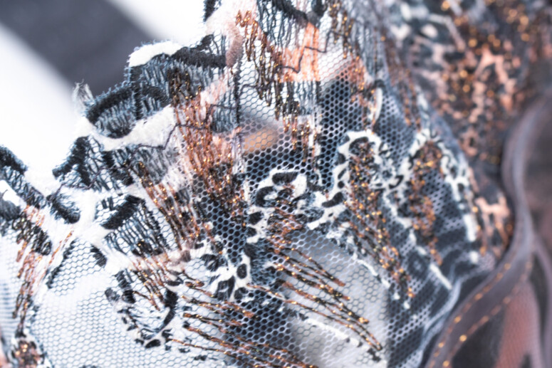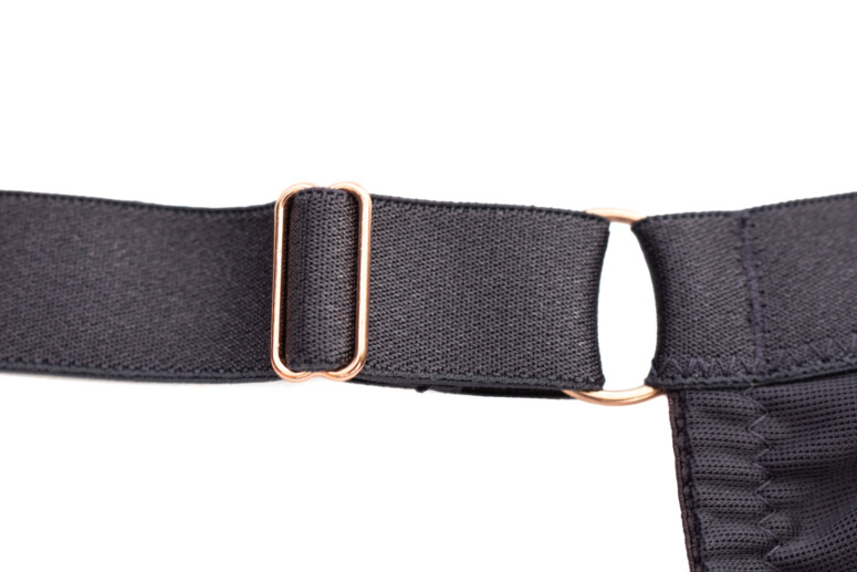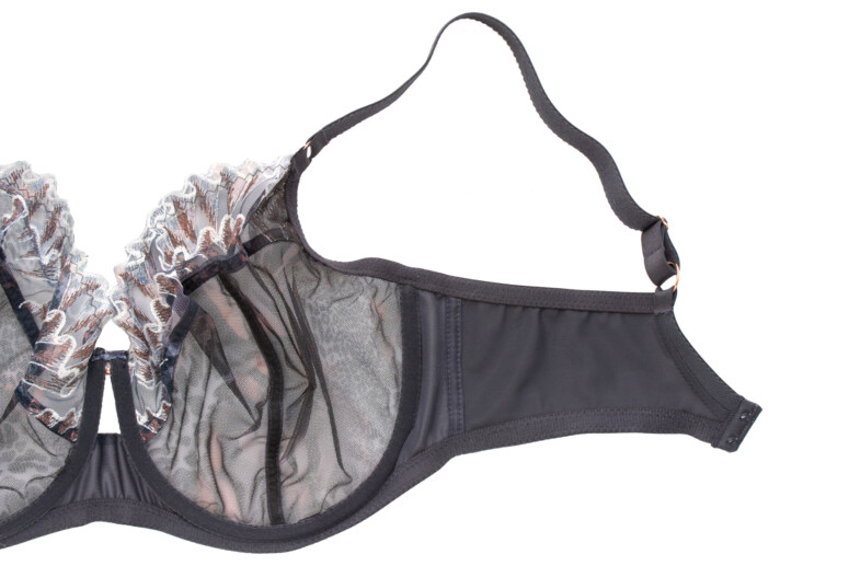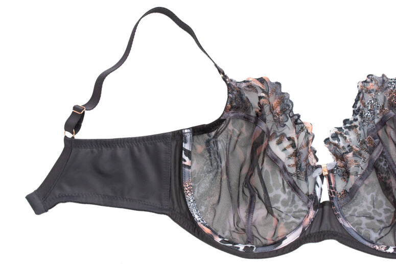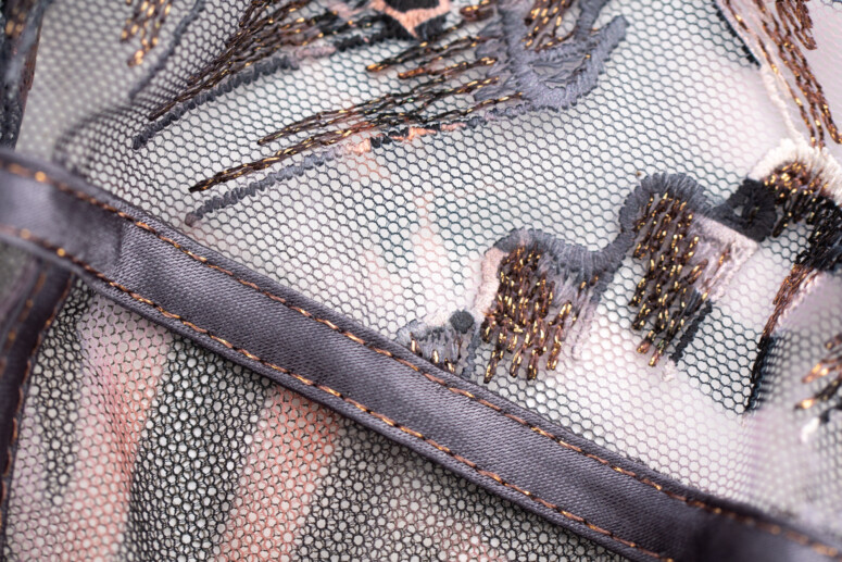 Nadruk, oprócz samych miseczek, trafił też na lamówki okalające miseczki. Lamówki wykańczające szwy są za to gładkie, grafitowe i przeszyte tą samą miedzianą nitką, która połyskuje w haftach. Na mostku pyszni się odjechany detal: ozdoba w kolorze różowego złota ze szkiełkami oraz kokardką z plisowanego tiulu, przywodzącą na myśl wachlarze. Czego tu nie ma! Dzikość, bling, wachlarze… glamurnie 🙂 Uwielbiam też ten prześwit na mostku – tak rzadko spotykany, a daje tak przyjemny, lekki efekt.