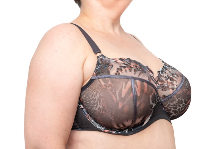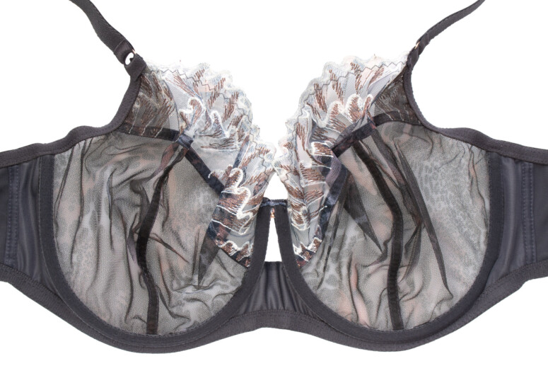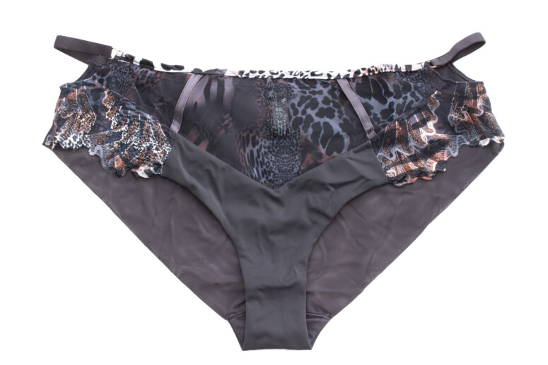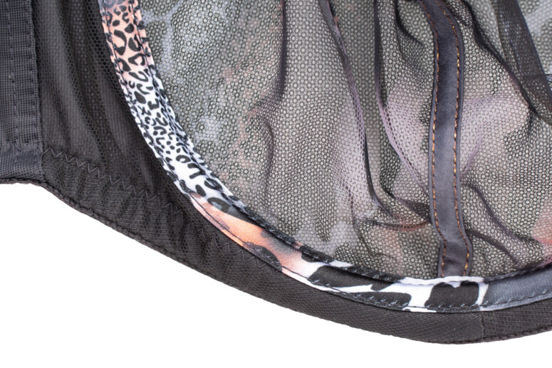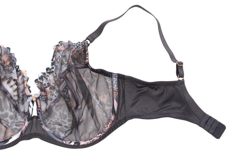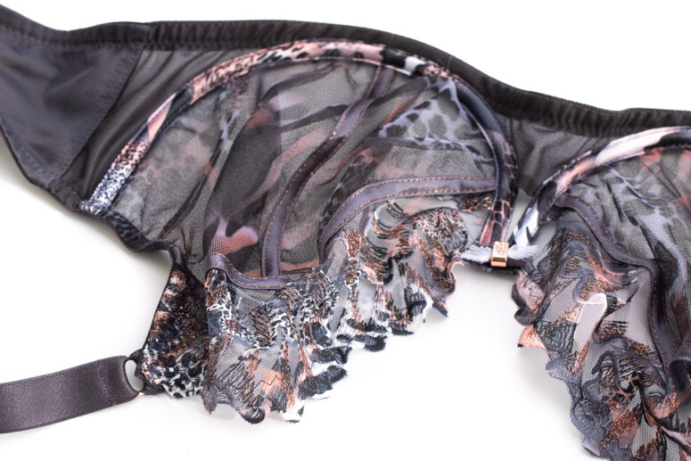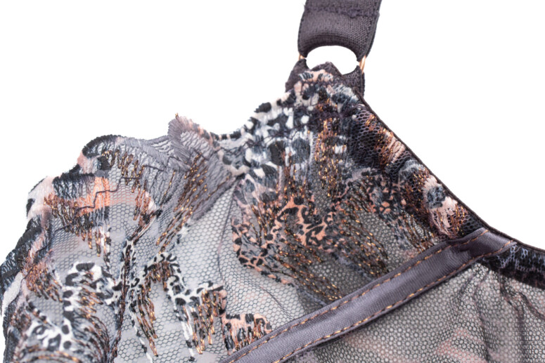 Sophie Chaton to już któraś z kolei wersja modelu Sophie. Poprzednich nie recenzowałam – haft Sophie co prawda jest urodziwy zarówno w kolorze piasku z dodatkiem bieli, jak i w czerni i granacie, ale dopiero wersja kocia zrobiła na mnie piorunujące wrażenie z cyklu „musisz to mieć” :-). Pierwsze skrzypce gra tu zresztą nie haft, a nadruk – cały tiul miseczek pokrywa zwierzęcy deseń ze zmiksowanych cętek, łatek i pasków w odcieniach szarości i moreli z czernią i bielą, tworzących tu i tam ombrowate przejścia. Szczególnie wyrazisty staje się w miejscach zahaftowanych – zastosowano tu albowiem technikę druku sublimacyjnego (znaną nam już z kilku innych modeli), w ramach której wzór jest nanoszony na powierzchnię wcześniej zahaftowaną białą nicią. Tę biel widać zresztą, gdy spojrzymy na stanik od spodu. Haft wzbogacony metaliczną, miedzianą nitką tworzy ostre linie, które kojarzą mi się z pazurkami 🙂 Efekt jest przyjemnie drapieżny, ale też pełen przepychu.