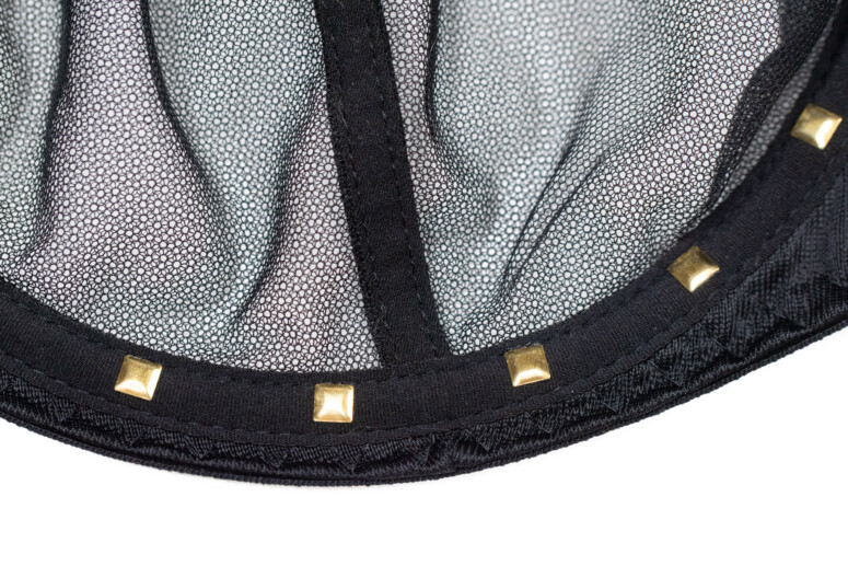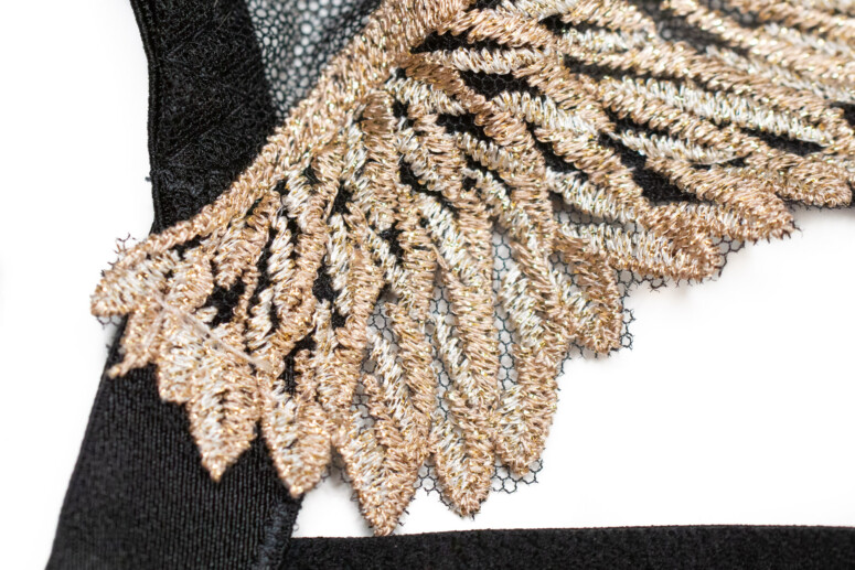 Wszystko w złotym kolorze, co harmonizuje z uskrzydlającymi aplikacjami á la Hells Angels. Hafty są wykonane dwoma odcieniami beżowej nici, co dodaje im trójwymiarowości, oraz wzbogacone złotą metaliczną nitką i naprawdę efektownie błyszczą. Szkoda, że przy dużym rozmiarze miseczek nie są większe. Zdjęcia katalogowe są trochę mylące – modelka ma ewidentnie mniejszy rozmiar niż ja, więc skrzydełka zajmują u niej większą procentowo powierzchnię biustu… a przecież im większy, tym większej powierzchni nośnej potrzebuje, by wzlecieć! 😉 Tak bardzo zatęskniłam do większych skrzydeł, że aż odjęłam za to pół punkta, ale to tylko moja osobista perspektywa.