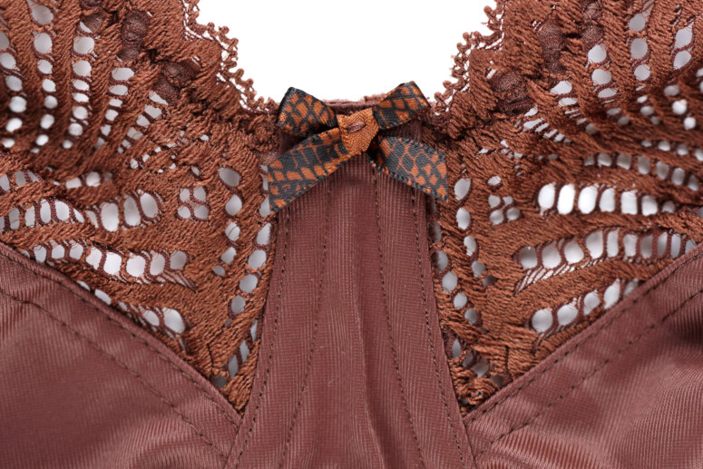 Jeszcze jeden kolor, obok którego nie potrafię przejść obojętnie! Uwielbiam czekolady, kasztany, palisandry, rudości. Ostatnimi czasy odcienie z rodziny kasztanowo-czekoladowych zaczynają coraz mocniej wchodzić do kolekcji bazowych w roli różnych odmian koloru cielistego, co witam z radością, i tym chętniej widuję je także w zwykle bardziej efektownych modelach sezonowych. Arianna ostatnimi czasy kusiła deseniami, w tej kolekcji będzie gładka z jedynym akcentem w postaci kokardki w wężowy wzór. Jest to model z elastyczną koronką u góry miseczki, ale skrojony inaczej niż Chi Chi – ma bardziej zabudowane miseczki i nie daje tak eksponowanej formy biustu.