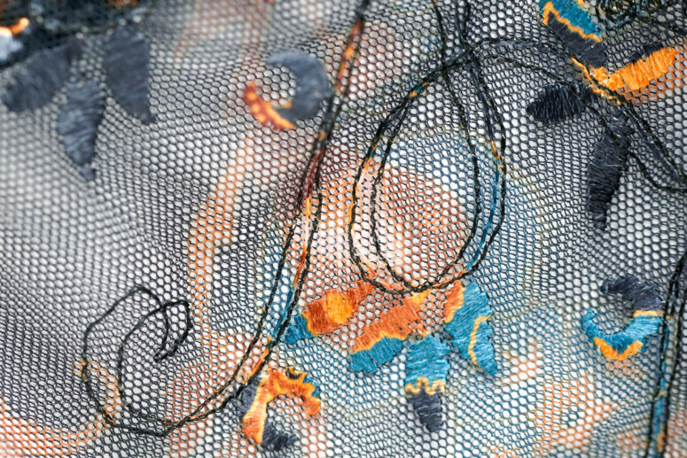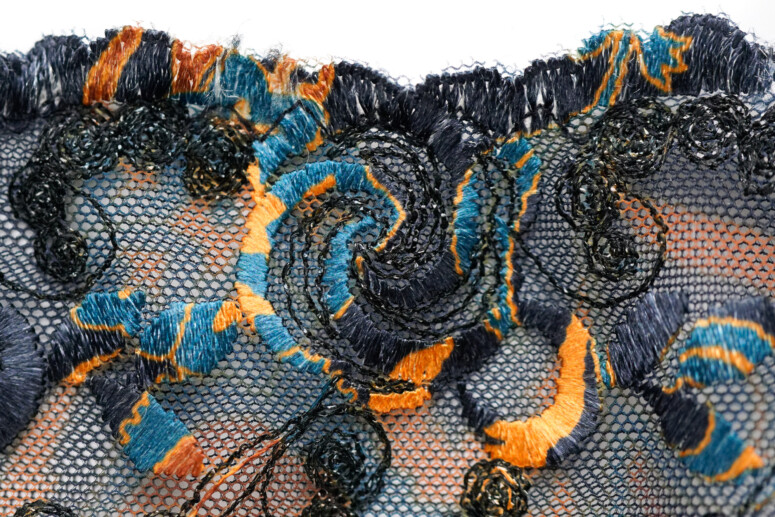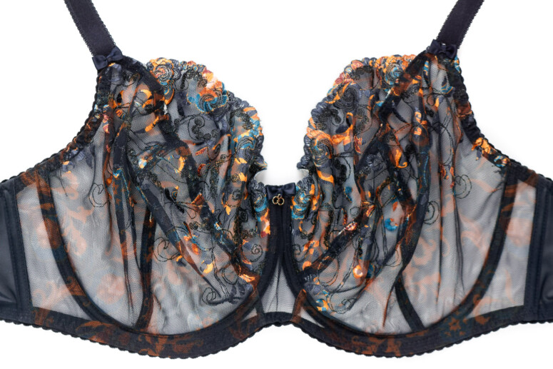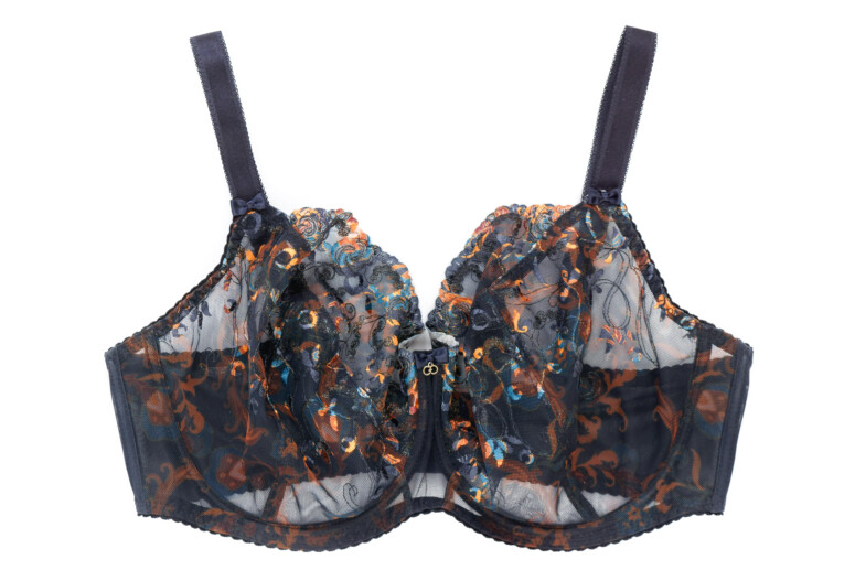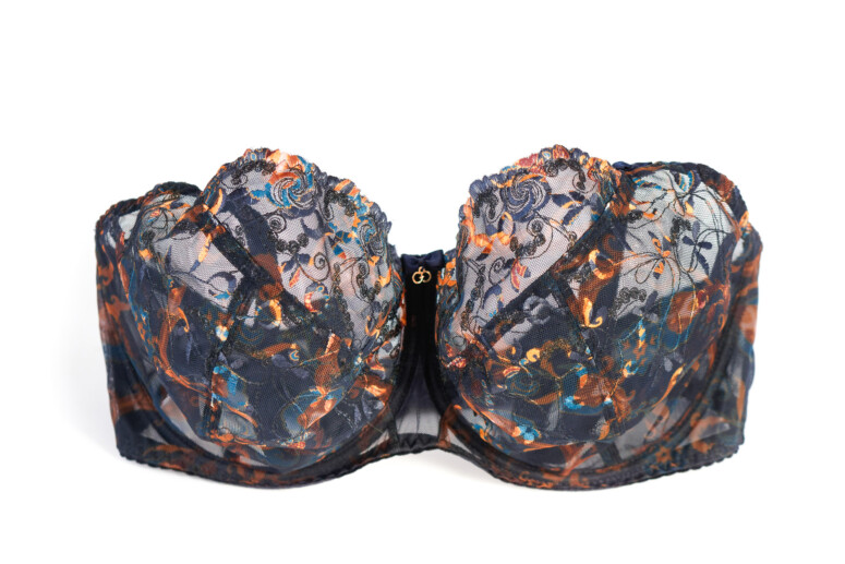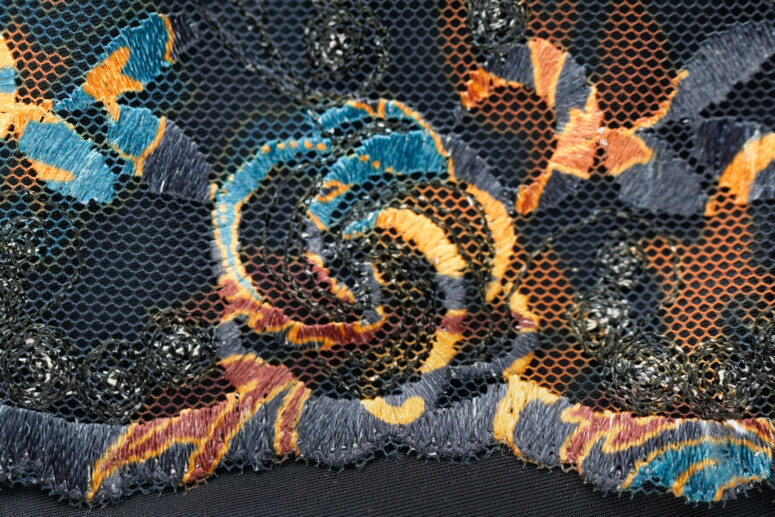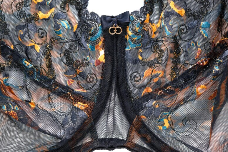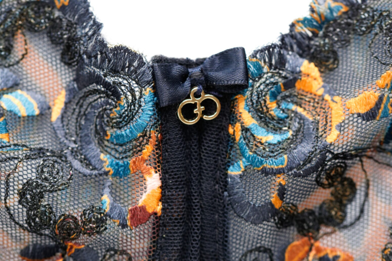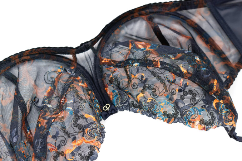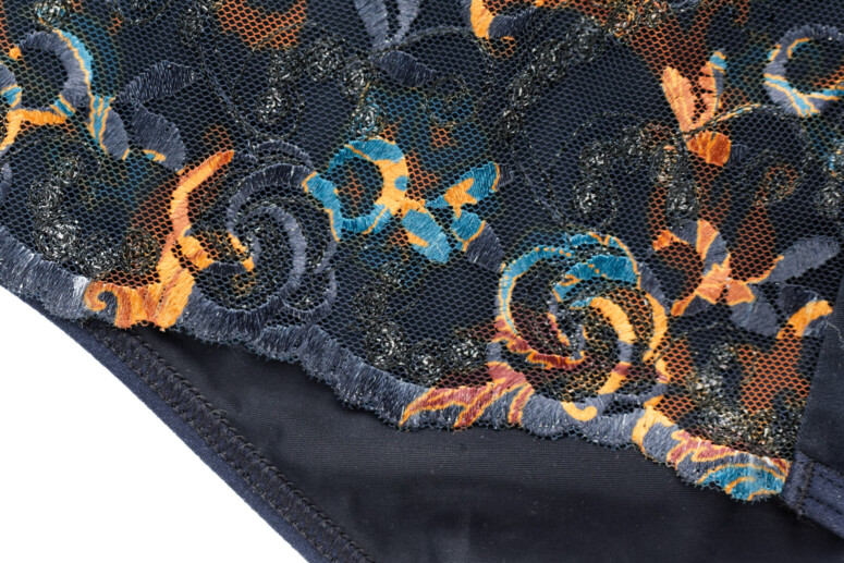 Główną atrakcją stanika Colorado jest oczywiście nadruk i haft, a właściwie kombinacja tych dwóch zdobień. Cały przód stanika jest zadrukowany roślinnym wzorem w odcieniach rudości, pomarańczu i niebieskości, a w górnych partiach – zdobiony dwoma rodzajami haftu. Pierwszy składa się z cienkich czarnych linii i zawiera srebrzystą metaliczną nić, co dodaje całości lekkiego, nienarzucającego się blingu, a drugi – to płaskie wzory, które zyskują wielokolorowość dzięki nadrukowi. Jak to możliwe? Haft został wykonany białą nicią, a następnie zadrukowany techniką druku sublimacyjnego. Polega ona na tym, że najpierw na drukarce zadrukowuje się wzorem specjalny papier, a następnie przenosi się wzór na materiał przy pomocy prasy termicznej, pod działaniem wysokiej temperatury. Jak widać na poniższych fotkach, zdobiony w ten sposób haft od spodu pozostaje biały.