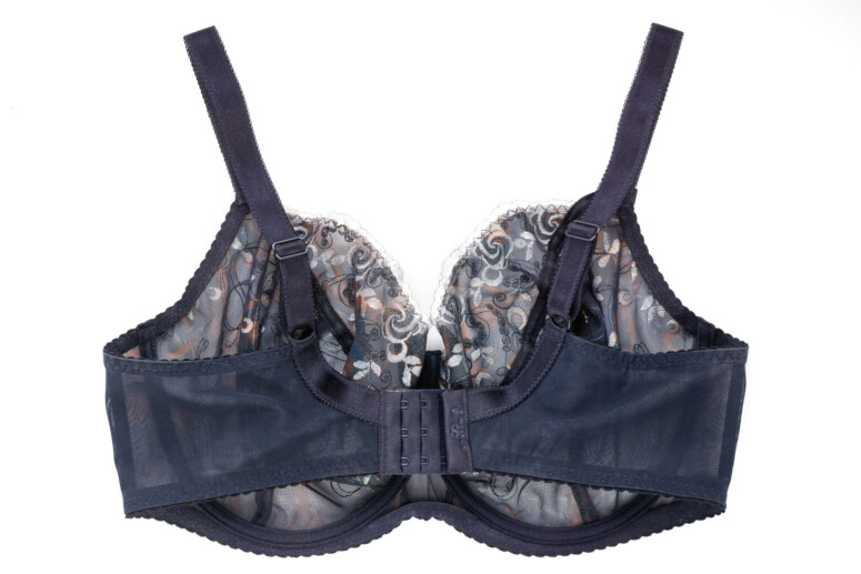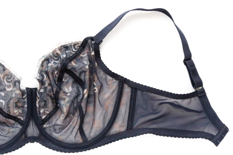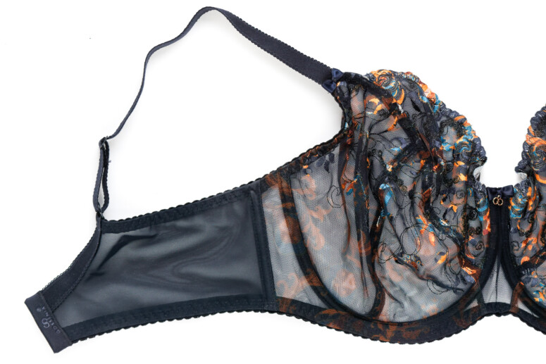 Spodnia warstwa miseczki. Hafty są tutaj przysłonięte drugą warstwą siatki, którą podszyte są miseczki od spodu, widać jednak doskonale biały kolor nici. Przy okazji widać też silikonową tasiemkę,  wzmacniającą krawędź miseczki stanika.