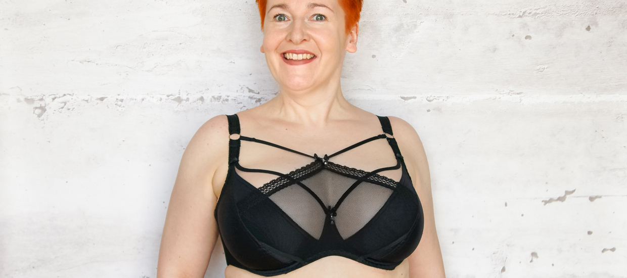 Już niemal tradycyjnie, jako „podkoszulek brafitterski” (czyli ubranie służące do sprawdzania, jaką formę ostateczną nadaje biustowi stanik) posłużyła mi bluzka polskiej marki Urkye, która tworzy ubrania na duży biust, a tak naprawdę – dla kobiet o różnych wielkościach biustu. Oprócz zwykłego rozmiaru konfekcyjnego („rozmiar talii”) mają one też, zależnie od materiału trzy (o, oo, ooo) albo dwa (o/oo, oo/ooo) rozmiary biustu. Ja mam na sobie bluzkę kopertówkę czarną w rozmiarze 46 o/oo (na metce zapisywane też 46 1/2). Warto zauważyć, że głębokość dekoltu w bluzkach kopertówkach Urkye jest regulowana – można ułożyć materiał tak, że będzie odsłaniał mniej lub więcej. Ja dla uzyskania odpowiedniego poziomu wyglądu wybrałam opcję głęboką 🙂