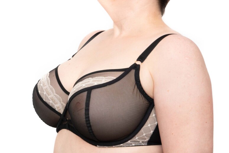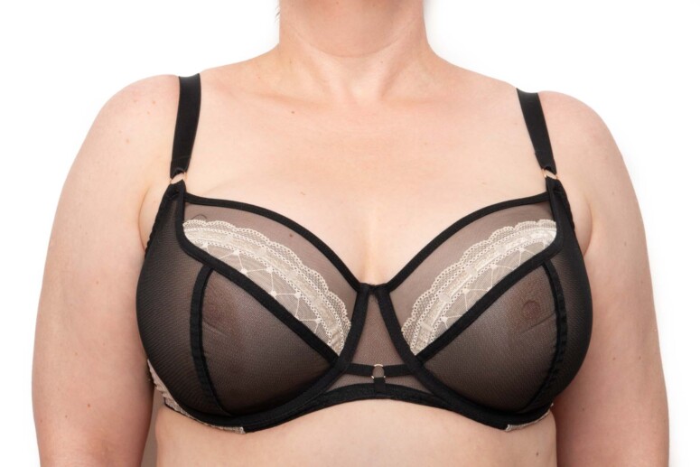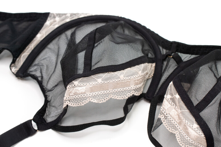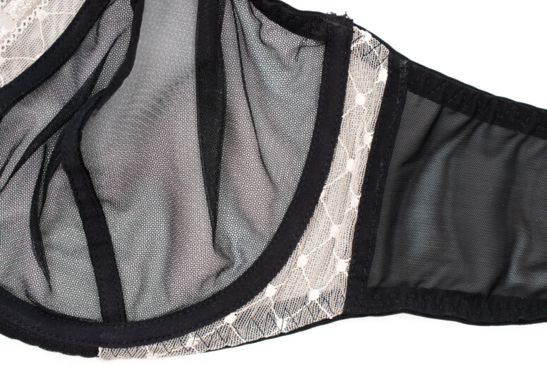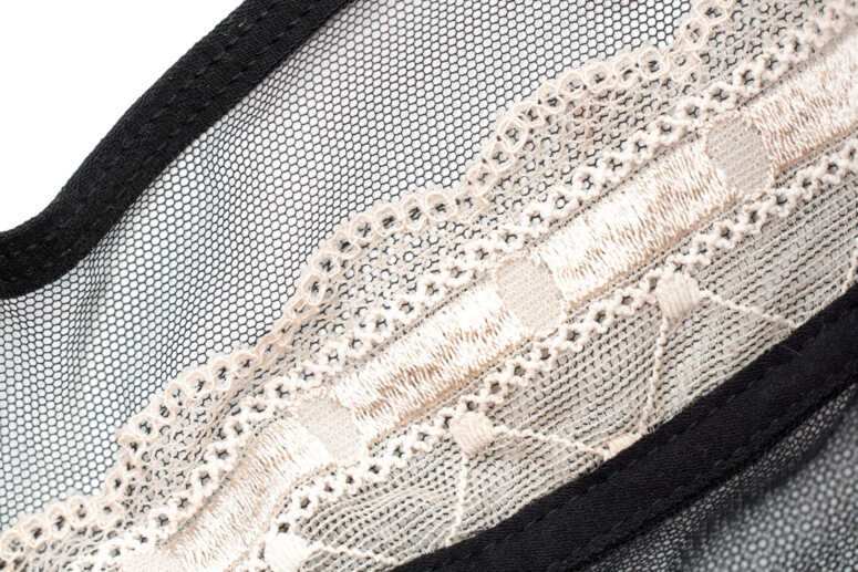 Za co jeszcze cenię stanik Rock’n’Roll? Za przejrzystość! Czarny, mgiełkowy tiul zawsze cieszy. Tu co prawda dolna część miseczki składa się z dwóch wartstw, ale są one naprawdę bardzo cieniutkie i prześwitujące, co doskonale dostrzeżecie na fotkach nabiustnych.