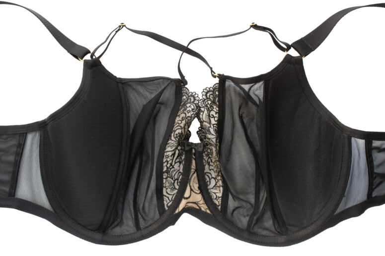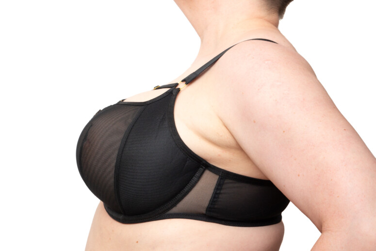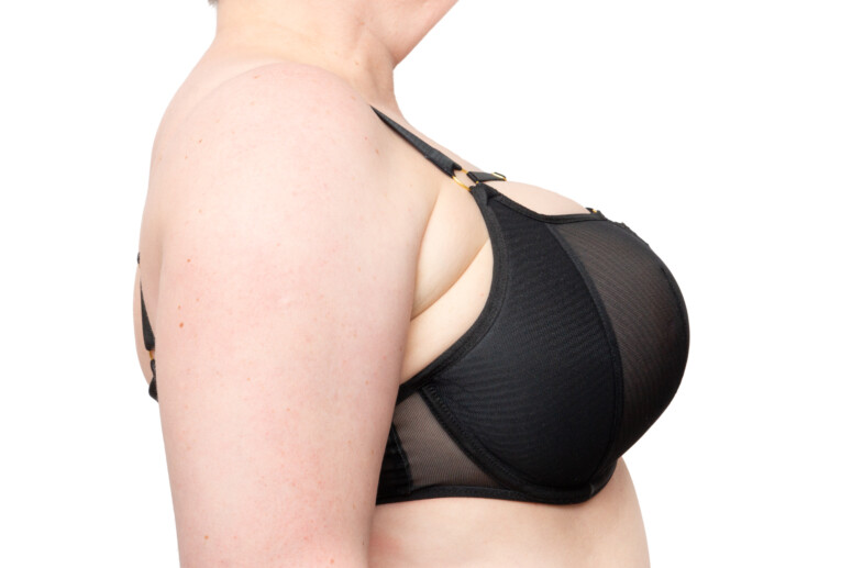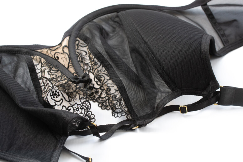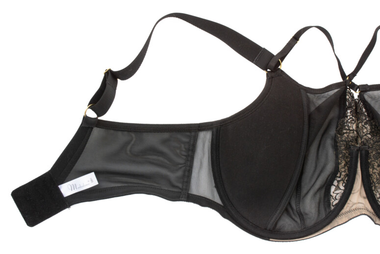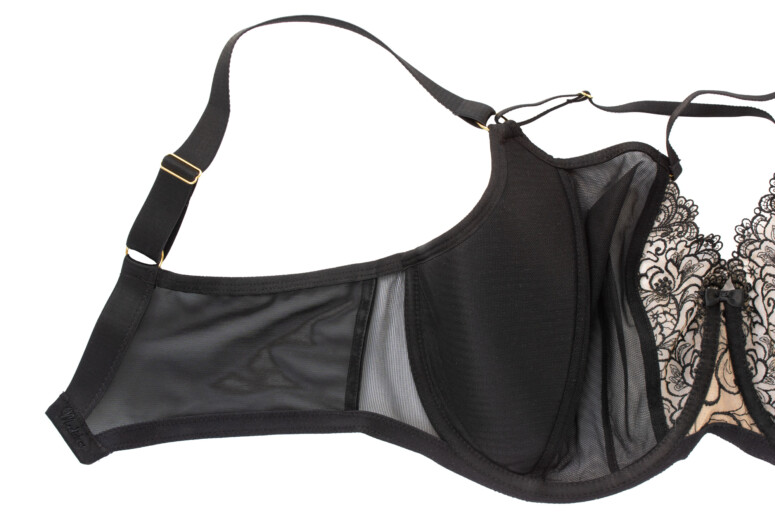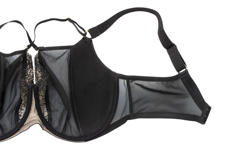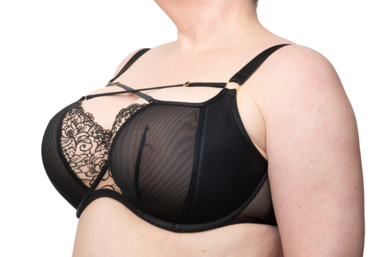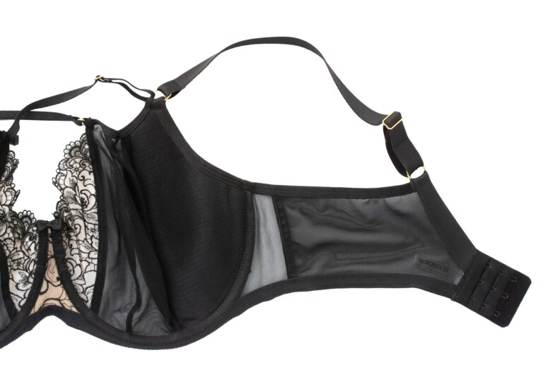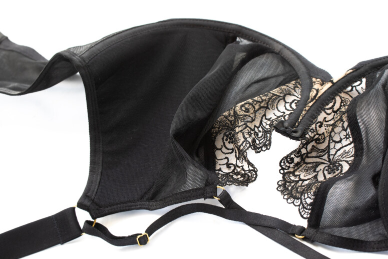 Układ szwów na tym modelu najlepiej widać na zdjęciu nabiustnym. W sumie mamy tu do czynienia z dwoma pionowymi cięciami i jedną pionową zakładką na części z czarnego tiulu. Jak już wspomniałam, środkowa haftowana część lubi mi odstawać na krawędzi, a moja brafitterska intuicja podpowiada mi, że to dobry model dla blisko osadzonych piersi o dużej projekcji, które dobrze wypełnią tę część.