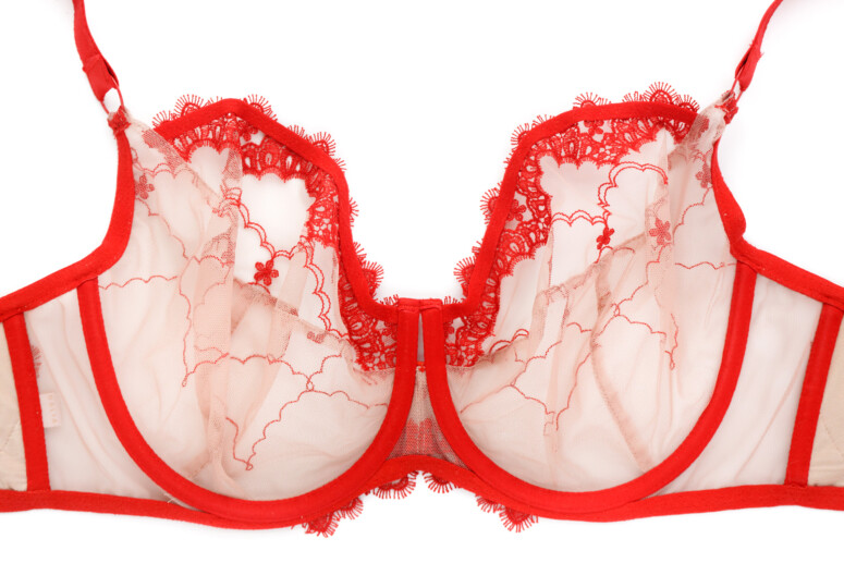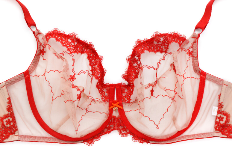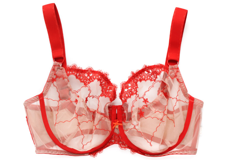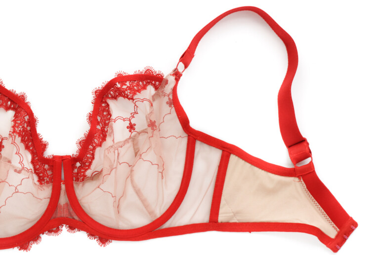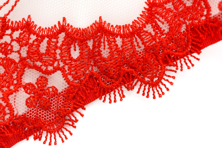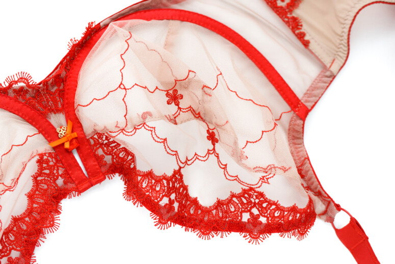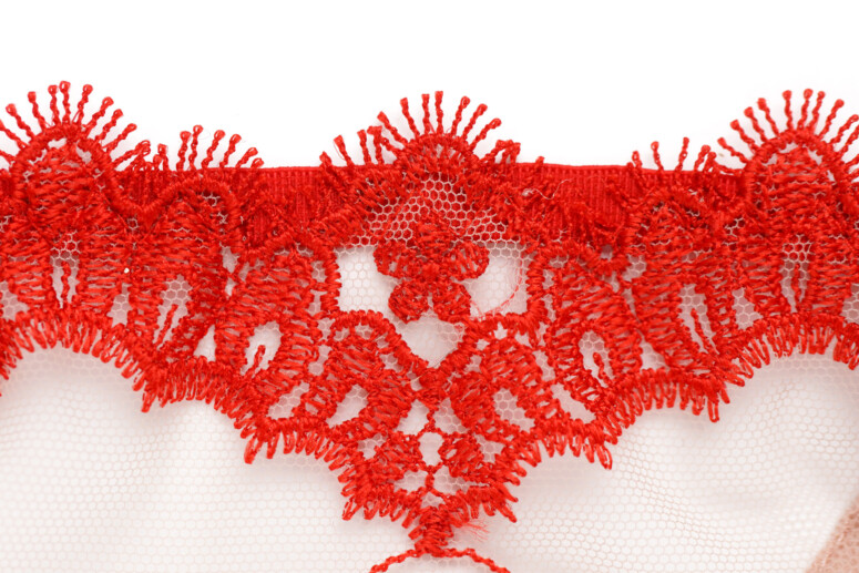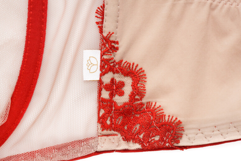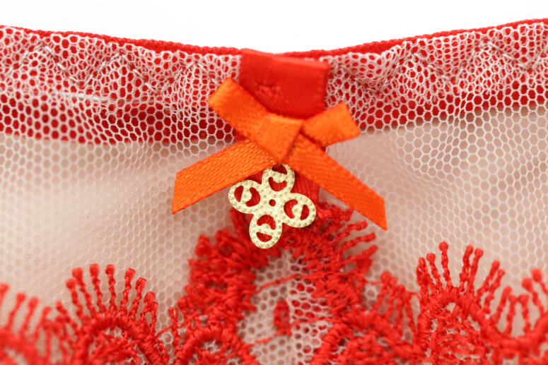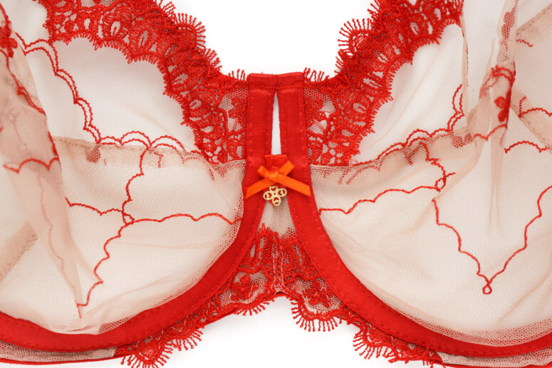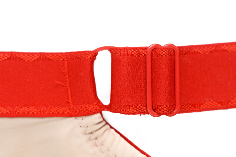 Ramiączka nie są zdobione haftem, mają tylko lekko ozdobne brzegi, dzięki czemu nie ma tu efektu „gołych” taśm. Towarzyszą im duże kółka. Same zresztą są bardzo szerokie, co kontrastuje z lekkością stanika, ale wygląda ciekawie właśnie dzięki tym łącznikom w postaci kółek. Zastanawiam się tylko, czy nie lepsze byłyby elementy złote, zamiast czerwonych?
