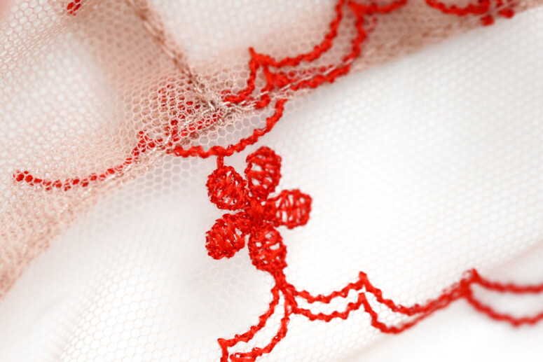 Haft ułożony jest w miarę symetrycznie na obu miseczkach. Na dolnej krawędzi mostka w noszeniu trochę się podwija, ale po obu stronach znajdziemy takie same elementy wzoru.