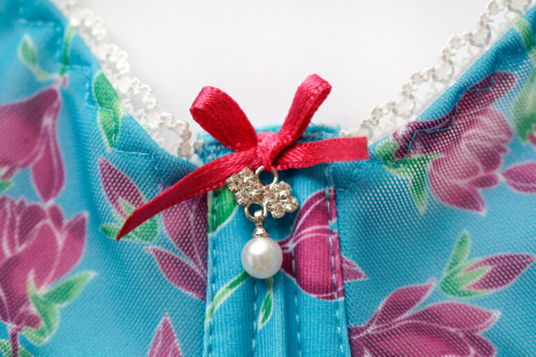 Z początku niepokoiła mnie biała gumokoronka na krawędziach miseczek. Coś mi tu nie pasowało, wydawało się przypadkowe, coś jak „nie było innej, więc doszyto białą”. Czy nie mogłaby być turkusowa? Albo zgrana kolorystycznie z kwiatkami? Pewną metodę w tej przypadkowości dostrzegłam z czasem. Biały fajnie kontrastuje ze skórą, współgra z białymi konturami widocznymi w nadruku, a przede wszystkim nadaje całości specyficzny klimat babcinego ogródka, perkalowych zasłonek w wiejskim domku, szydełkowych serwetek na stoliku. Dokładają się do tego wrażenia amarantowe kokardeczki i staroświecka perełka w zawieszce.