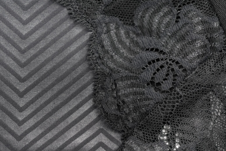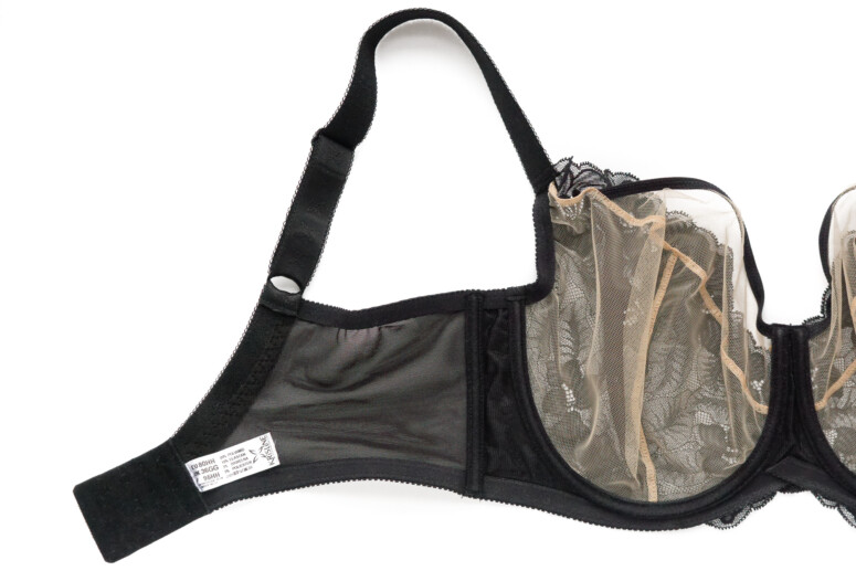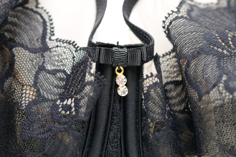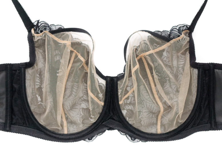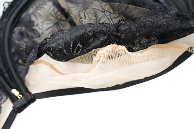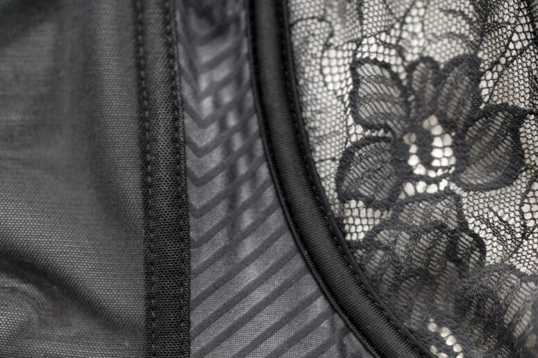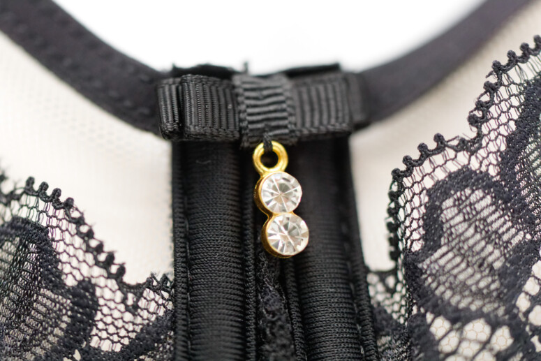 Koronce towarzyszy spód z cieniutkiego tiulu, który stapia się ze skórą i daje z daleka to przyjemne optyczne złudzenie nisko zabudowanej miseczki z paskiem czarnej lamówki. Czyli taki trochę „nibyhalfcup”, bo koronkowa warstwa wierzchnia przeszyta jest tylko jednym szwem – pionowym.