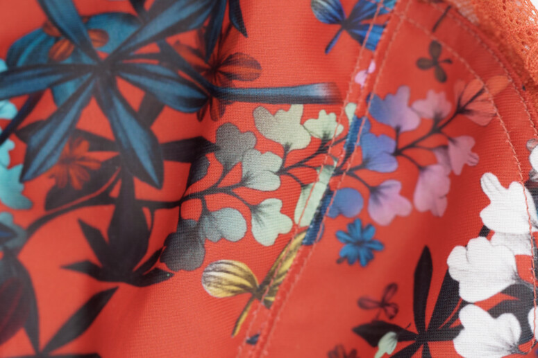 To nie jest „czerwony, po prostu czerwony”! 🙂 Niech Was nie zmylą niektóre zdjęcia. Chi Chi w wersji red floral bardzo lubi wychodzić jaśniejsza i bardziej intensywna niż jest naprawdę, nawet na moich fotach, gdzie staram się dbać o wierność koloru. W rzeczywistości jest to przygaszona, ciemna barwa, jak bardzo, bardzo dojrzałe pomidory czy jabłka. Na tym niebanalnym tle mamy nadruczek z ombrowymi przejściami. Dla mnie Chi Chi to musthave tej kolekcji, zwłaszcza że jest ona naprawdę dobrym modelem również pod względem konstrukcji i kształtowania, co miałam okazję sprawdzić i zrecenzować dla Was (w bazowej czerni). Plus wysokie figi – zawsze plus! 🙂