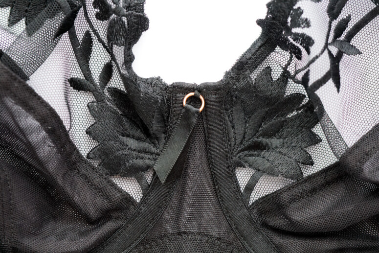 Kolejna nowość i przedstawicielka nurtu subtelnej elegancji. Lula to model plunge, czyli bardziej wydekoltowany pośrodku. Większy rozmiar nie musi przecież oznaczać, że mamy zawsze wbijać się w pełne miseczki czy unikać większych dekoltów! Obniżony mostek jednak zwykle oznacza ograniczony zakres rozmiarów i tak też jest w tym przypadku (zwróćcie uwagę na rozmiarówkę). Górna część miseczek Luli jest także zrobiona z elastycznego materiału i bardzo gładka, a całość – przyjemna w dotyku i delikatna. Trudno mi jednak przetestować konstrukcję (side-support z obniżonym mostkiem), ponieważ w tym modelu najbardziej ze wszystkich daje mi się we znaki niezgodność rozmiaru sampli (36F) z moimi wymiarami 🙁 Ciekawą możliwością są odpinane ramiączka z tyłu, co pozwala je skrzyżować na plecach. Może to poprawić podtrzymanie.