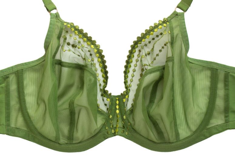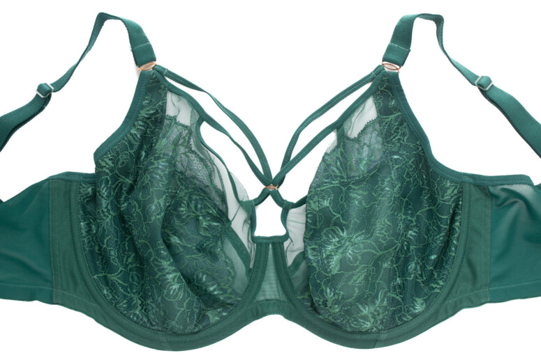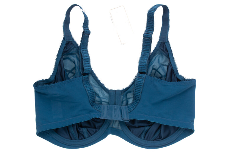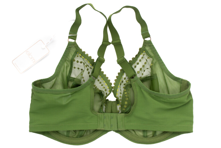 Druga Teagan to usztywniany pianką gorseciarską half-cup w wydaniu Elomi, czyli może nieprzesadnie odkrywający, ale tworzący balkonetkowy efekt linią dekoltu i pionowymi szwami na miseczkach (drugim w kolekcji halfem jest halfowa wersja Brianny rainforest). Krawędzie miseczek od góry są przykryte haftem, co może maskować ewentualne odstawanie czy inne efekty na styku z piersią.