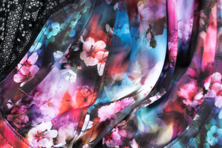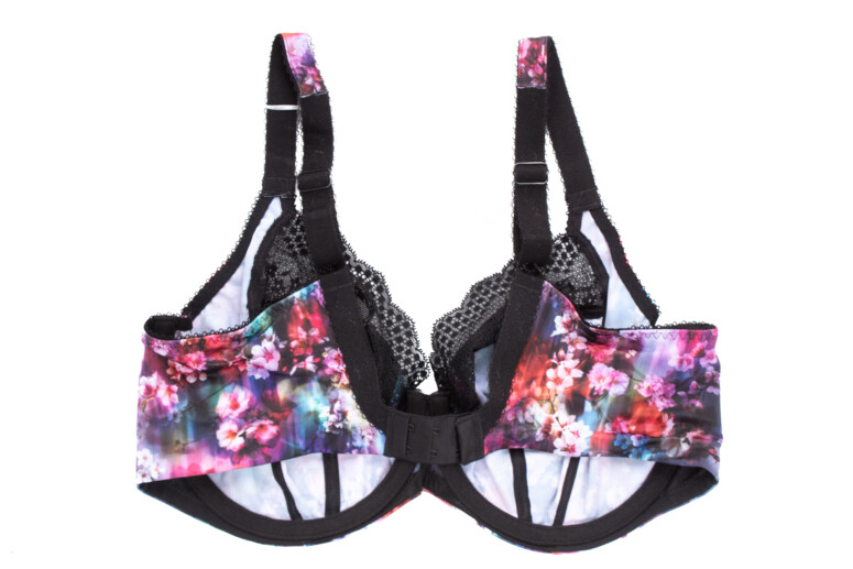 Lucie to kolejny, obok Morgan, model z nadrukiem i elastyczną koronką, ma jednak wyraźnie obniżony mostek, podobny wysokością do Matildy. Testowałam ją kiedyś w wydaniu radośnie pastelowym, ale chyba bardziej mi się podoba w mocniejszych kolorach. Tu mamy niby wiosenne drzewa owocowe (cherry blossom), ale zanurzone w jakiejś ciemnej, psychodelicznej przestrzeni różowo-fioletowo-niebieskiej. Taką gęstą do szaleństwa kwiateczkowość mogę lubić. W tym sezonie zadrukowane są również skrzydełka tylne (w mojej wersji były z koronki w panterkę).