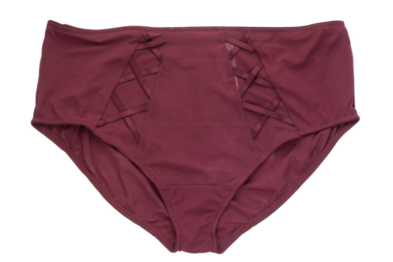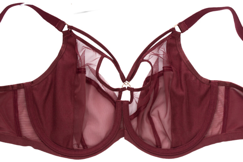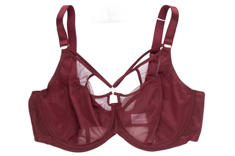 Wspomniana wcześniej Sachi, etatowa kusicielka Elomi, wystąpi w winnym bordo (cabernet). Krojowo podobna do Brianny, również wywodzi swój rodowód od niżej zabudowanej Matildy. W sumie zawsze brakowało mi w kolekcji Sachi w tym kolorze. Zwracam uwagę, że oprócz tego „motyla” w dekolcie Sachi oferuje też sporo przejrzystości, jednak boczne panele są wzmocnione zlaminowaną nieprzejrzystą warstwą. To niezły trzymacz mimo lekkiego wyglądu (zobacz moją recenzję koszulki Sachi babydoll). Bardzo lubię ostatnio w Sachi ten metalowy element łączący paseczki pośrodku.
