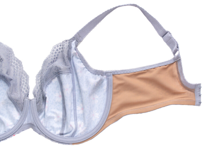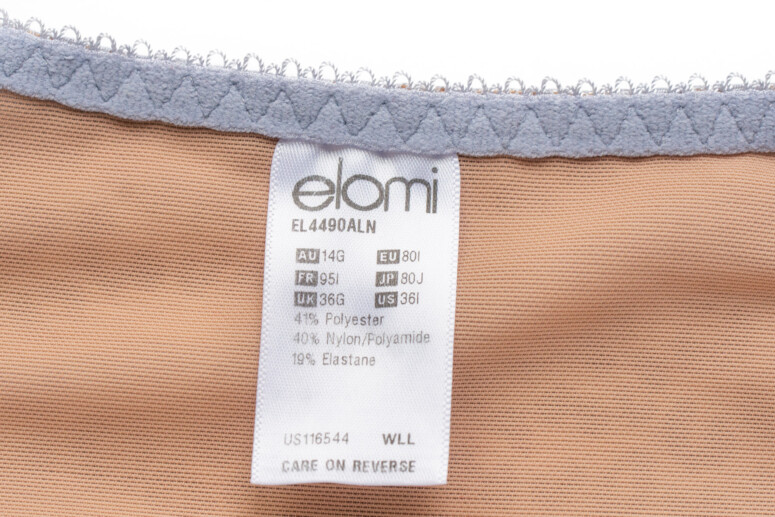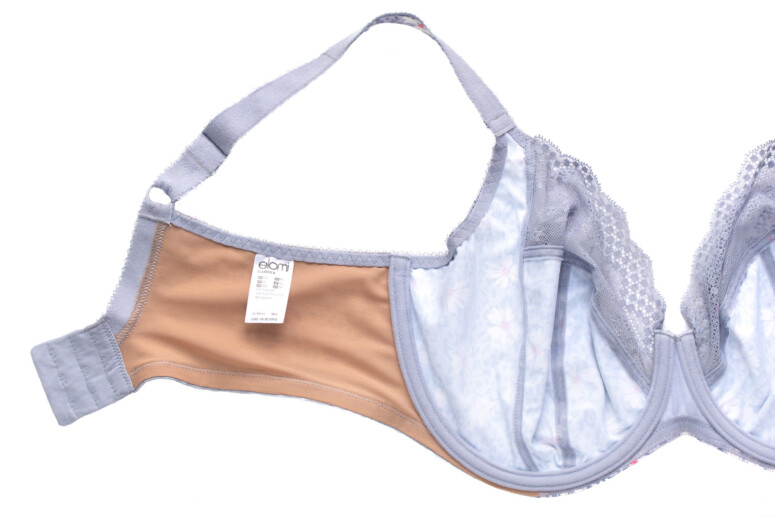 Miseczki, podobnie jak w większości modeli Elomi, są skrojone z 4 części, z boczną częścią (tą od strony fiszbiny, z której wychodzi ramiączko) zwaną panelem bocznym. Taki krój nazywany jest side-support. Szczególnie dobrze nadaje się do ogarniania dużych biustów na dużych ludziach ? i generalnie jest moim ulubionym typem konstrukcji. W wydaniu Elomi część boczna jest duża, większa niż w wielu innych markach i to moim zdaniem stanowi o jej skuteczności. Ramiączko dzięki temu ciągnie pierś nie z samego boku, a nieco bardziej z przodu. Duży side-support pozwala też na wygodne podkrojenie pod pachą, co jest szczególnie ważne przy dużych wymiarach ciała. Fiszbiny mają szerokie łuki, dostosowane do szerszych piersi – takich jak moje, a nawet szerszych. Są też dość sprężyste, nie sztywne, więc naddają się do ciała, a jednocześnie nie są nadmiernie giętkie i nie pozwalają na zbyt duże odkształcanie miski.