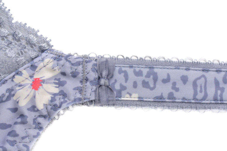 Trzeci plus – ramiączka. W przedniej części są obszyte dzianiną z miseczek i prezentuje się to świetnie, daje wrażenie dopracowania. W dalszej części ramiączka mają typowy dla Elomi połyskujący kwiatowy wzorek. Są szerokie (25 mm w moim rozmiarze), co nie każdej stanikomaniaczce odpowiada, ale w dużych rozmiarach harmonizują z całością.