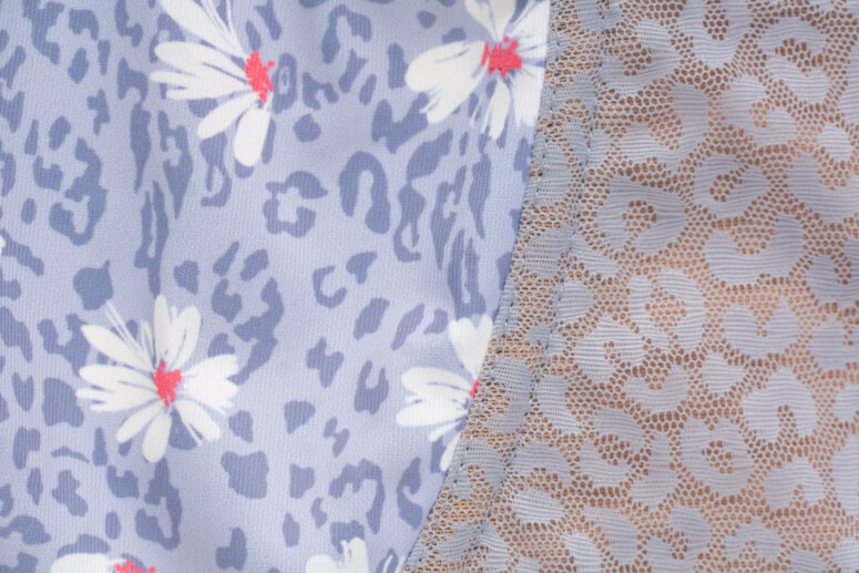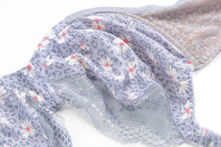 To teraz się wytłumaczę, dlaczego z nagła chłodne pastelowe szaroniebieskofioletowe odcienie trafiają na żądny nasycenia barwnego, preferujący cieplejszą kolorystykę biust ? Lucie w kolorze aleutian rzeczywiście nie podbiła mojego serca od razu, ale zyskała przy bliższym poznaniu. Początkowo chciałam przede wszystkim sprawdzić, jak będzie układała się u mnie ta elastyczna koronka w górnej części miseczki, a estetycznym argumentem za były panterkowe cętki obecne zarówno na miseczkach, jak i – w postaci elastycznej koronki – na skrzydełkach obwodu. Bardzo też spodobały mi się półprzejrzyste z tyłu figi. Po raz pierwszy poznałam tę wersję w postaci próbek materiałów, kiedy pojawiły się zapowiedzi kolekcji Elomi na aktualną wiosnę.