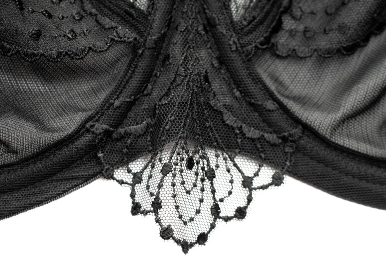 Ogon ów nie jest przytwierdzony do obszywki, lecz dopiero do granicy tuneli fiszbin, dzięki czemu w czasie noszenia po prostu łagodnie się odgina, nie zadziera gwałtownie do góry, oraz łatwo wraca na swoje miejsce. Innymi słowy, leży sobie spokojnie na skórze i zdobi. Haftem ozdobiono też miseczki w górnej, przejrzystej części oraz częściowo w dolnej, zlaminowanej z dwóch warstw.