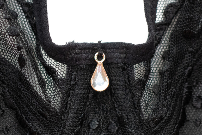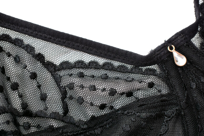 Ładne to wszystko i jak zwykle jakościowe. Materiały są zdecydowanie solidne, ale przy tym przyjemne w dotyku i sprawiające lekkie wrażenie, zwłaszcza tiul i haft. Boczne panele są całkowicie kryjące i przez to z profilu ciut przytłaczają wizualnie, ale postarano się to zminimalizować m.in. przez to, że dzianina pod zewnętrzną warstwą tiulową ma połysk. Do tego widok przejrzystości z przodu i ten mgiełkowy detal pod mostkiem moim zdaniem równoważą czarną jednolitość.