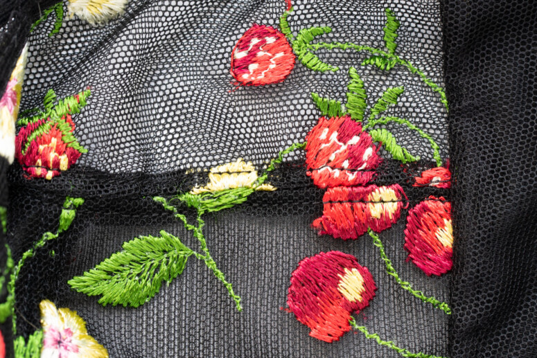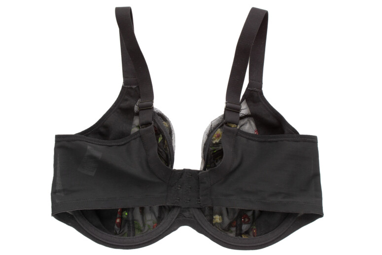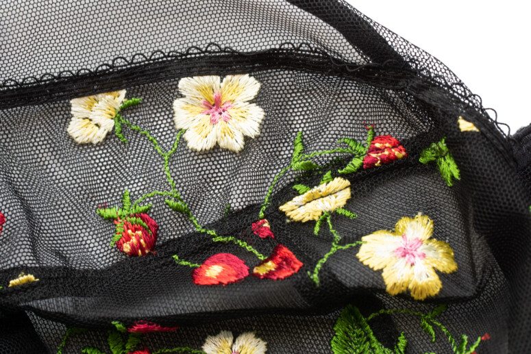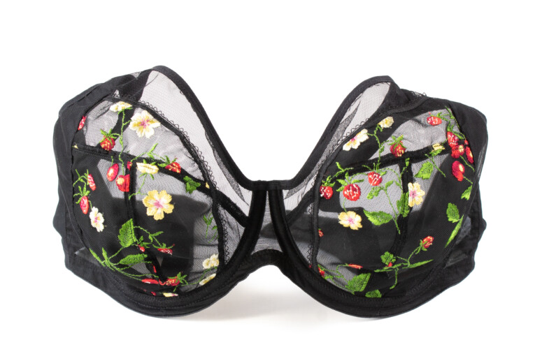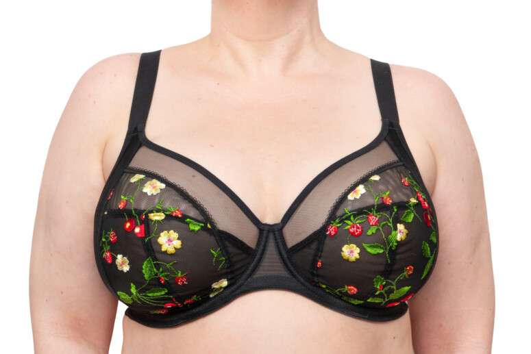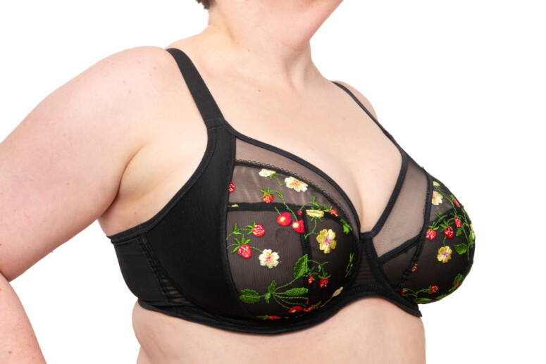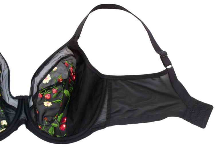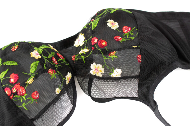 Jak widać, przejrzystość jest obecna, choć dawkowana – najbardziej przejrzysta jest góra miseczki, dół – tylko lekko, jako zbudowany z dwóch warstw: haftowana siateczka plus mocniejsza markizeta od spodu. Boki miseczki (panele side-support) są nieprzejrzyste, bo wzmocnione od środka stabilną dzianiną. Na mostku ozdób brak, i może to dobrze, bo hafty są wystarczająco efektowne. Choć ja mimo to nie obraziłabym się o jakąś truskawkę czy wisienkę. Podoba mi się to ozdobne wykończenie na granicy haftu.