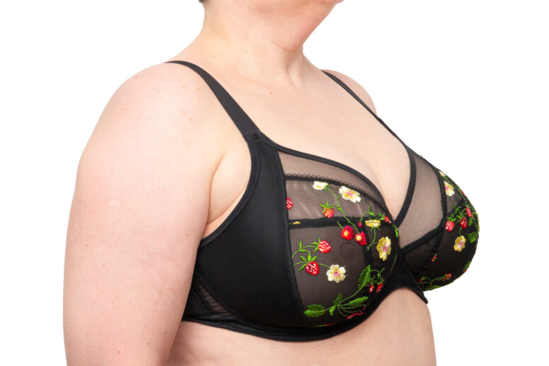 Jak twierdzę nie od dziś, uwielbiam kroje typu side-support. O co chodzi? O te duże części miseczki z boków, z których wyprowadzone są ramiączka. Staniki Elomi side-supportami stoją i słusznie, bo to świetny krój dla dużych ciał i większych biustów. Tak duży boczny panel, jaki stosuje ta marka, daje konstruktorce swobodę w kwestii wykrojenia pod pachą – można je zrobić tak, by było komfortowe dla grubszej osoby i by krawedź stanika nie wbijała się w pachę. Do tego ramiączko można od tejże pachy bardziej oddalić, co znowu ma znaczenie i dla wygody, i dla podtrzymania (im bliżej środka, tym stabilniej i tym skuteczniejsze ciągnięcie piersi w górę).