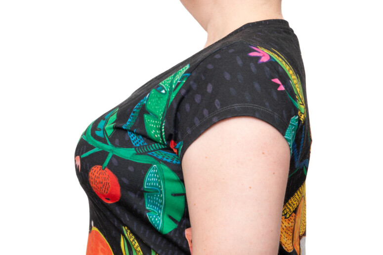 Forma biustu w Samirze jest ogarnięta, nie jest mocno zebrana ani wywindowana ostro do góry – taka OK po prostu. Dla mnie spoko 🙂 Jedyne, co ciut mi przeszkadza, to ta lekka bułka krawędziowa, której nawet nie bardzo widać na fotkach i szczęśliwie występuje od strony mostka, gdzie nie ma szans przebijać przez ciuch. Widzę ją tylko ja, gdy patrzę sobie w dekolt, i jej nie czuję. Hafty niestety trochę przebijają przez ubrania – nie jest to stanik pod opięty cienki wiskozowy t-shircik, ale pod letnią kiecką czy kolorową bluzką nic nie będzie zakłócało odbioru.