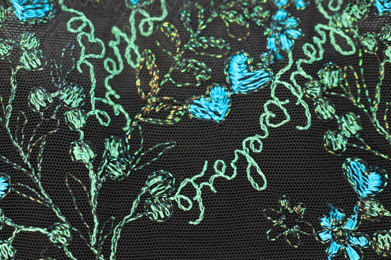 Co dodatkowo przyciąga w hafcie, to bling. Nie jest to jakiś tam zwykły dodatek złotego czy srebrnego lureksu – w tych metalicznych nitkach dominuje zielony kolor, co pogłębia barwę haftu, plus widoczne gdzie niegdzie pomarańczowo-niebieskie refleksy. Szczególnie dobrze udało mi się je uchwycić na tym niezbyt ostrym zbliżeniu majtek (wszelkie błyski najlepiej widać, gdy wychodzą nieco z ostrości).