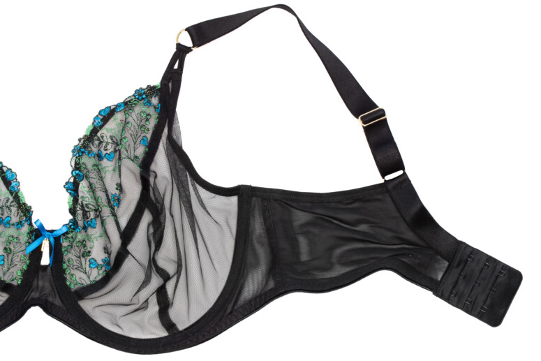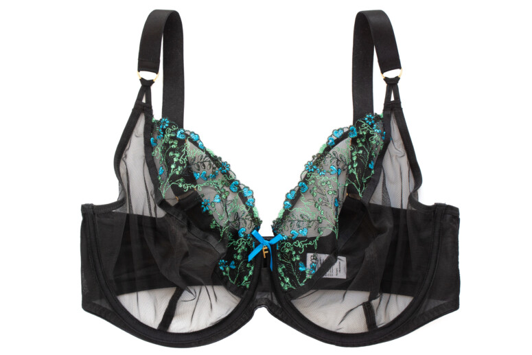 Co tu dużo mówić – mgiełczak klasyk, z tych, które kochamy od lat. Jedna warstwa tiulu przez całą miskę, i to w pełnym zakresie rozmiarowym (kiedyś ta przejrzystość sięgała tylko do brytyjskiego G, pamiętacie? Teraz do H, co z grubsza odpowiada polskiemu J-K). Haft ma dziewczęco-słodką, trochę tatuażową estetykę – niebieskie i zielone serduszka i kwiatki plus czarne kontury, a w to wszystko wplecione zielone napisy Freya (dlatego łatwo zgadnąć markę, widząc jedynie haft – może przez to wzbudził we mnie taki sentyment? ?).