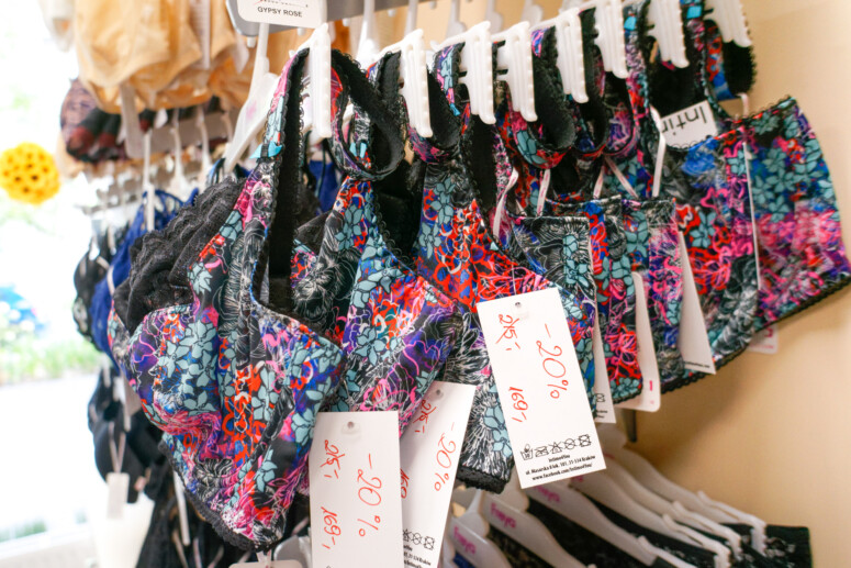 Wizyta w salonie była dla mnie ciekawym przeżyciem – sklep „znam” już od tylu lat, ale nigdy w nim nie byłam 🙂 Pamiętam, jak dawny adres przy ul. Wysłouchów podawało się automatycznie wszystkim biuściastym dopytującym, gdzie w Krakowie kupić dobry stanik z dużą miseczką. Adres się wprawdzie zmienił (na bliższy centrum), ale filozofia działania i doboru asortymentu chyba pozostała ta sama.