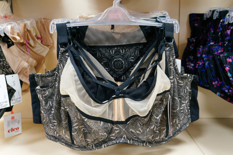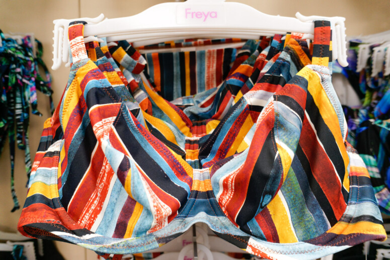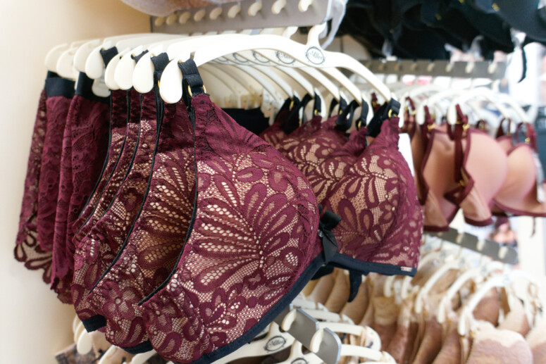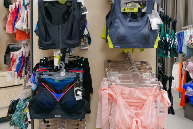 Standy pełne biustonoszy ułożonych markami i rodzajami. Na pierwszym planie – sportowe, w głębi – push-upy w bazowych kolorach.