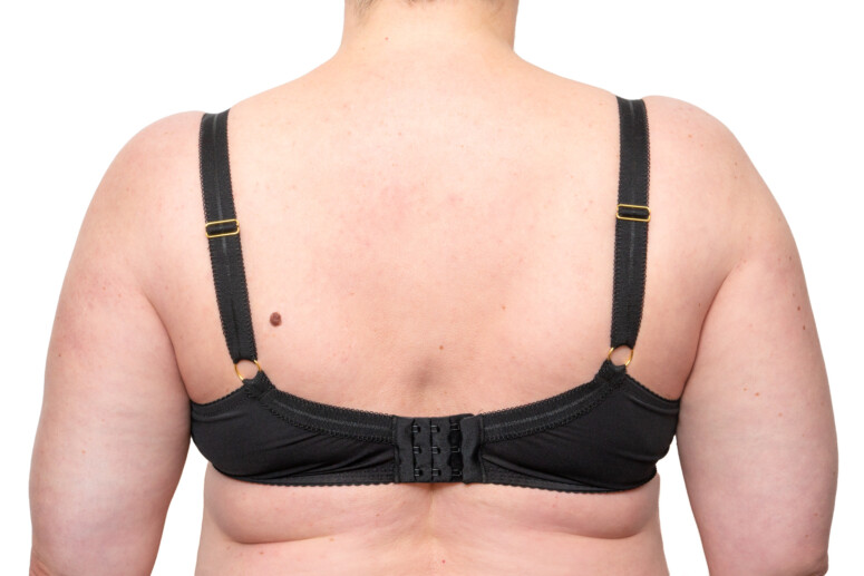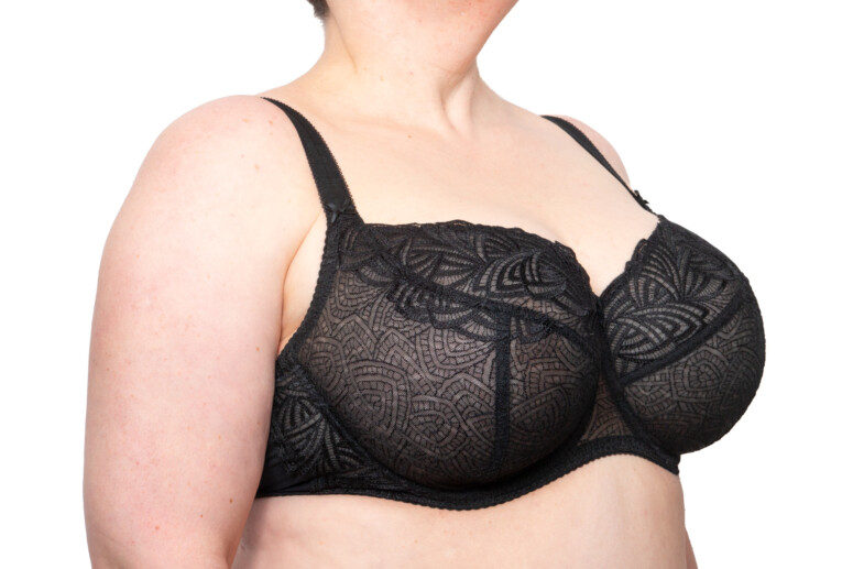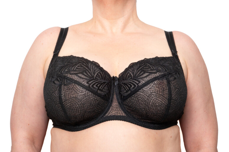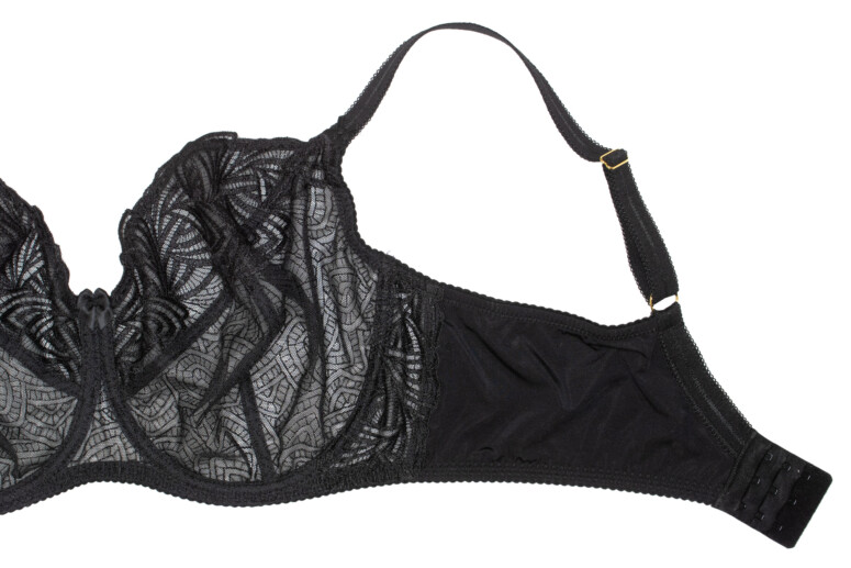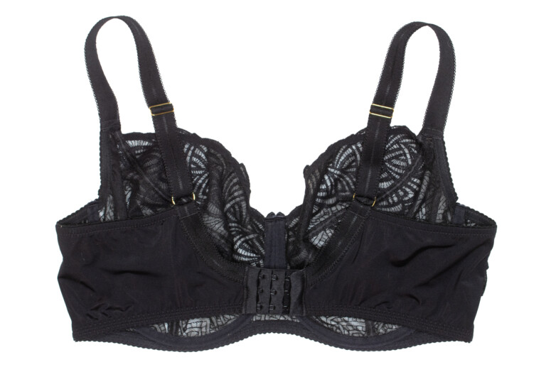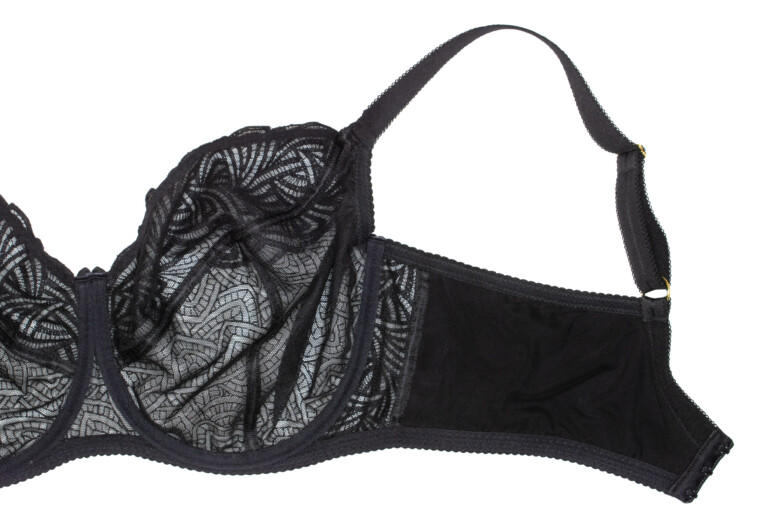 Tył zbudowany jest z dwóch warstw: dzianina i powernet. Mógłby być może ściślejszy, ale: nie jest rozwlekaczem, pracuje zupełnie przyzwoicie i jak na mój ciężar – daje sobie radę. Ma na szczęście trzyhaftkowe zapięcie. Ramiączka również pracują standardowo. Miseczki są dość stabilne ze względu na gęste zahaftowanie oraz dwuwarstwowość. Ciekawa jestem, jak radzi sobie Rina w rozmiarze na przykład 85J (dwie miseczki więcej niż moja). Być może przydałoby się jej jeszcze trochę wzmocnienia.