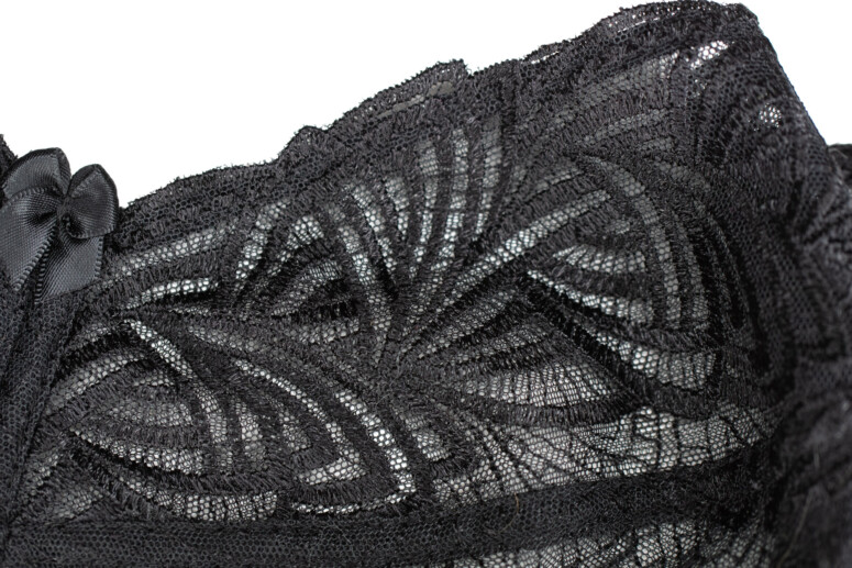 Wracajmy jednak do naszych staniorów. Haft na Rinie ściele się gęsto i łączy dwa równie ciekawe motywy. Miseczki są podszyte w całości dodatkową warstwą tiulu, przejrzystość jest więc jedynie połowiczna, ale mimo to wzorki całkiem ładnie widać. Szkoda tylko, że nie pomyślano o czymś ciekawszym niż zwykła kokardka na środku. Tył jest po prostu czarny, gładki, nawet na majtkach nie dzieje się za wiele, choć nieco więcej niż na staniku.