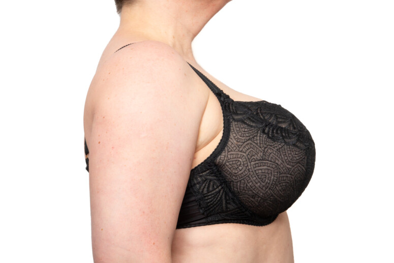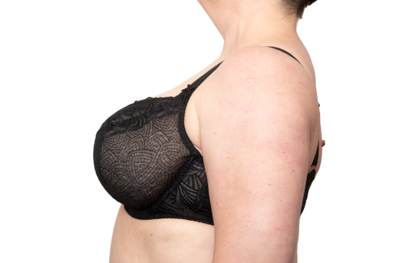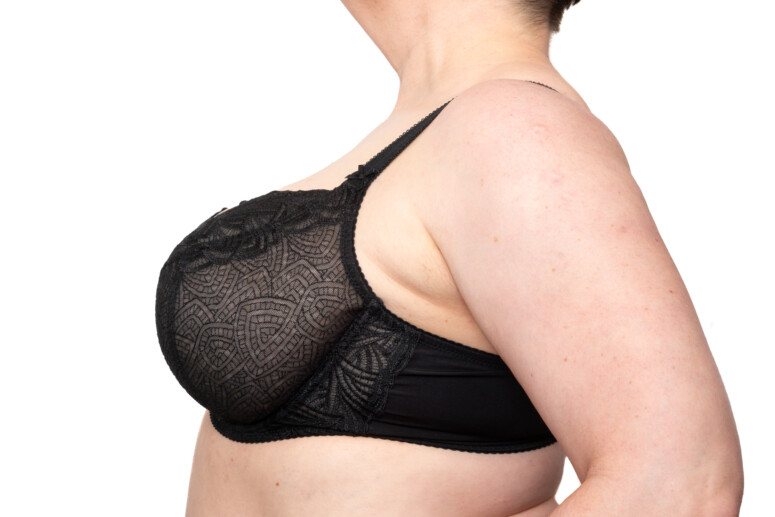 Na etapie pierwszych przymiarek konstrukcja podlegała jeszcze ostatnim poprawkom i tu miałam okazję zwrócić uwagę na mój największy problem – nadmiar przestrzeni w górze miseczki. Już w modelu Hot miałam luźnawą krawędź miski, tu było to bardziej widoczne, ale udało się wprowadzić korekty niemal niwelujące ten efekt. Mówię: niemal, bo w moim przypadku wciąż jest to stanik pasujący mi bardziej w drugiej połowie cyklu 🙂 W mojej ocenie najbardziej ucieszy osoby o pełnych biustach, które często borykają się z tak zwanym wcinaniem krawędzi. Jeśli jesteś jedną z tych, którym „wszystko się wcina”, szukasz miseczek otwartych, bez gumek na krawędzi czy ściślejszych lamówek, B171 i Rina są dla Ciebie. U mnie w górze zostaje lekki luz, który jednakowoż nie jest widoczny ani w dobrze wyprostowanej pozycji, ani w ubraniu, gdy wszystko leży jak należy.