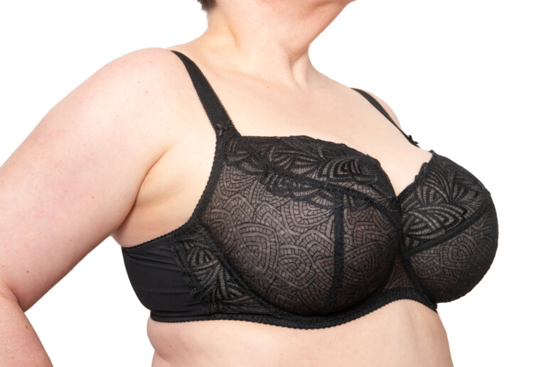 Jak już wspomniałam przy okazji kształtowania, Riny B171, podobnie jak innych modeli Ewy Bien, mimo że jest celowana w duże wymiary, nie można nazwać modelem o szerokich fiszbinach. W moim H mieszczę się na szerokość „tak jak zwykle w polskich drutach w tym rozmiarze” 🙂 co oznacza: wolałabym, by były rozstawione szerzej, ale osoba o sylwetce z wąską podstawą piersi powinna być usatysfakcjonowana. Blisko umieszczone piersi ucieszy wąski mostek.