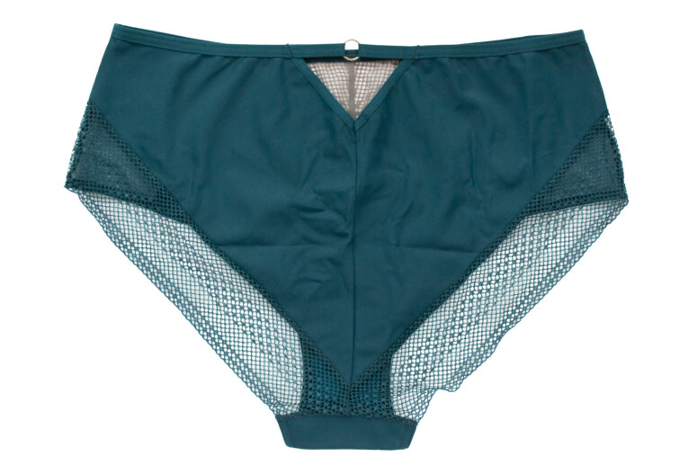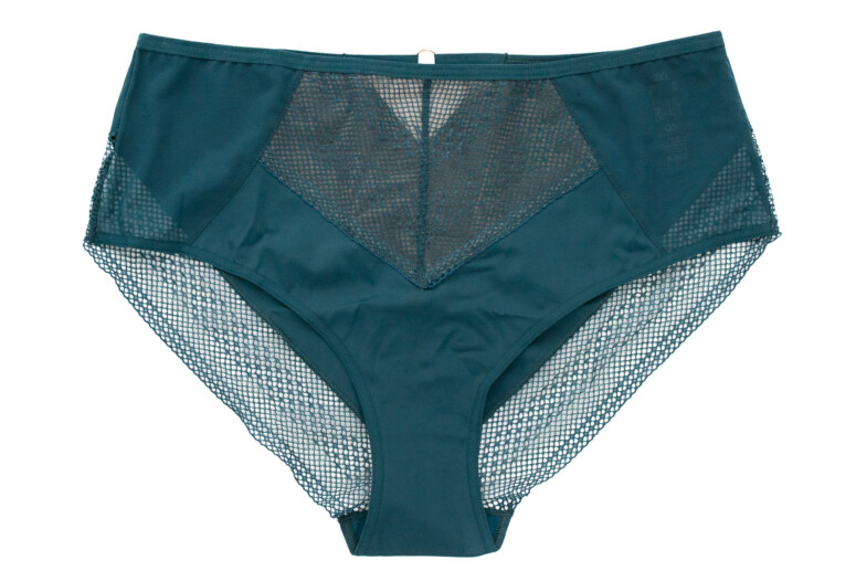 Może nie są to najperfekcyjniejsze majtki świata, ale daję im maksa z przyjemnością, bo idą w zdecydowanie dobrym kierunku, jeśli chodzi o potrzeby nieco większych zadków 🙂 Mają dla mnie świetną wysokość, są wygodne, niedrapiące i niegniotące, elastyczne w całości, a przy tym wizualnie zupełnie nie są ciężkie, mimo zabudowania. Są bardzo ładnie wycięte dołem – jak wiele dobrych majtek marek specjalizujących się w plus size. Może tylko trochę brakuje im połysku, który harmonizowałby z biustonoszem. Za to prezentują się równie ciekawie z przodu, jak z tyłu.