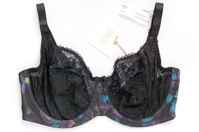 Amelie to trochę nietypowa wariacja na temat czerni. Zwykle wzorzyste są miseczki, a reszta gładka, a tu – dokładnie odwrotnie. Przyznam, że nie jestem do końca przekonana do tego rozwiązania, ale kto wie, może się z nim oswoję. Jest to miękki stanik o kroju side-support, „na oko” podobny do Jasmine czy Envy. Koronka ma bogaty, wyrazisty wzór, trochę kojarzy mi się z koronką w modelu Estel z marki Sculptresse (i jest to dobre skojarzenie). Trochę szkoda, że z tyłu Amelie jest po prostu czarna…