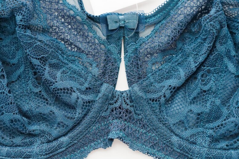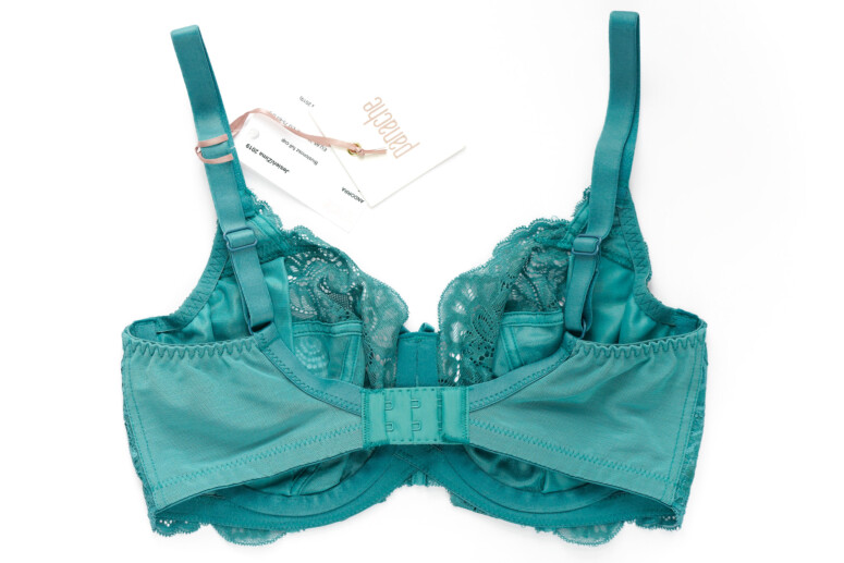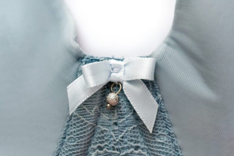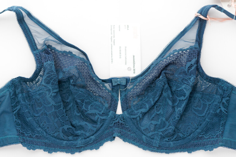 Cóż, nie widziałam nigdy błękitnego pudru, ale cienie owszem 😉 W tej kolekcji znalazły się aż dwa odcienie rozbielonego niebieskiego. Ardour reprezentuje cieplejszą, bardziej turkusową frakcję o nazwie blue haze. Jest to model o termicznie tłoczonych miseczkach o kształcie dekoltu typ sweetheart (serduszko), nieco niżej niż przeciętnie zabudowany na mostku, ale na pewno nie jest głębokim plandżem. Miseczki są powleczone całkiem lukśną w dotyku satyną, podobnie jak ramiączka z przodu, a reszta – miękką koronką. Luksusowy charakter Ardoura podkreśla jeden z nielicznych w tej kolekcji elementów biżuteryjnych (zerknijcie do podrozdziału Detale poniżej). Wewnętrzna wyściółka miseczek w docelowym staniku (bo to, co widzicie na zdjęciu, jest dopiero próbką) ma być dostosowana kolorem do reszty.