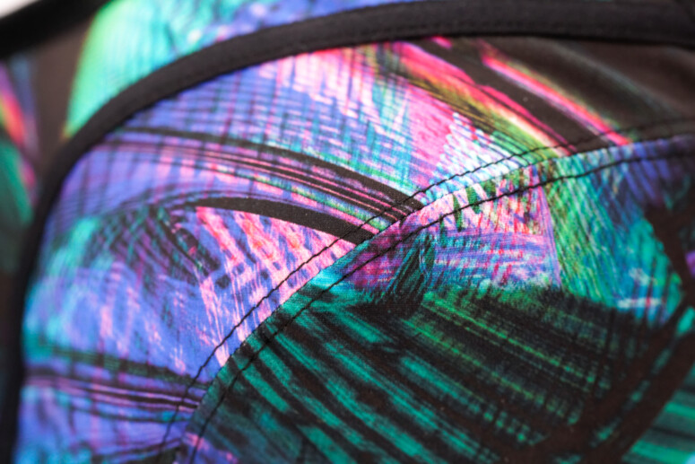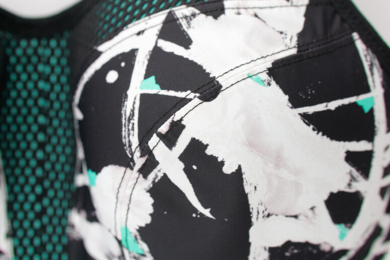 A oto druga wersja kolorystyczna fiszbinowca, też ciekawa. Nazywa się graffiti print, ale mnie kojarzy się jakoś skaliście – przyrodniczo. Podoba mi się ten dodatek szmaragdu, no i oczywiście sportowa siateczka. Pasowałby mi do siatkowej spódnicy 😉
