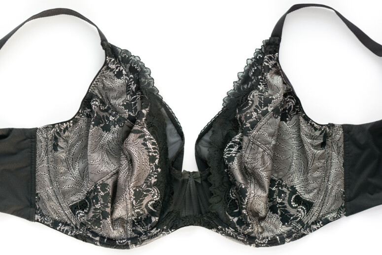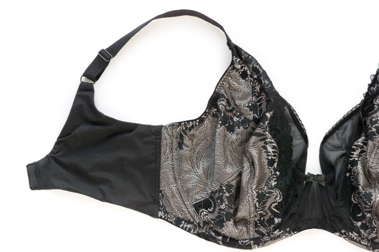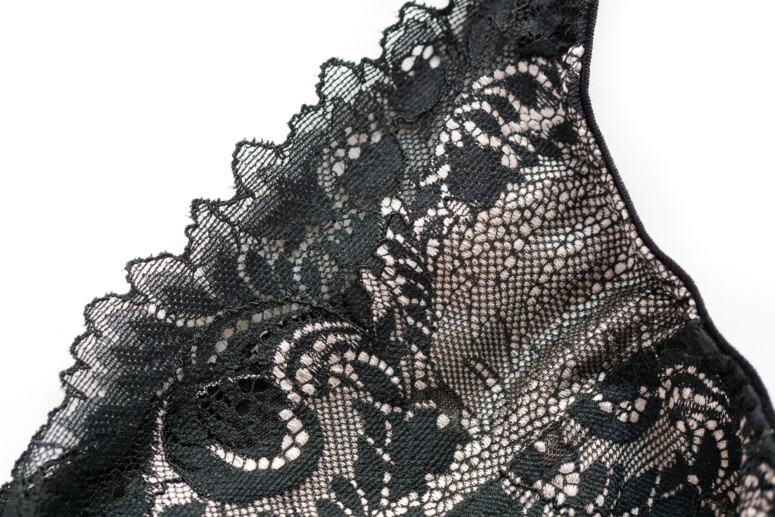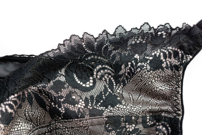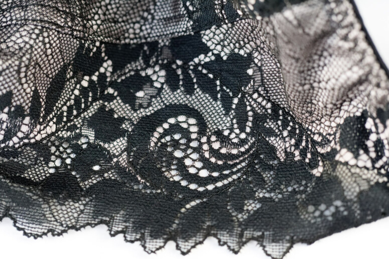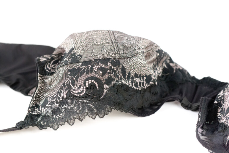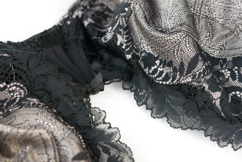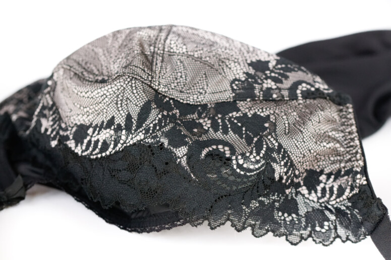 Elastyczna koronka pokrywa dolną-boczną część miseczek oraz jest nałożona na górną-środkową w charakterze wydłużonej w górę warstwy, pod którą znajduje się właściwa górna część miseczki z czarnego, również elastycznego tiulu. To zatem jeden z tych modeli, które łączą warstwowość z krojem high apex.