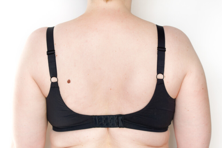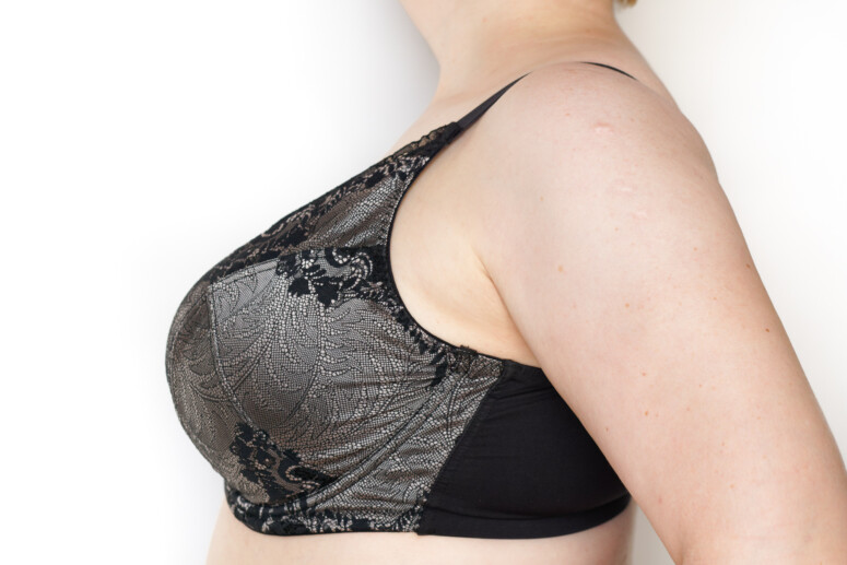 Spodziewam się tutaj krytycznych spojrzeń 😉 Wiele stanikomaniaczek jest przyzwyczajonych do piersi mocno zebranych do środka. Ja jestem, powiedzmy, mocno umiarkowana pod tym względem. Moje piersi są naturalnie rozstawione na boki oraz dość pełne po bokach, o szerokiej podstawie, więc w mocno zbierających modelach bywa mi niewygodnie. Nie jestem też mocno estetycznie przywiązana do efektu skupienia całego biustu z przodu. Oczywiście nie lubię siłowego rozstawiania, ale tutaj nic takiego się nie dzieje. Kształt biustu jest naturalny, dobrze podniesiony, ale nieszczególnie zebrany. Dla mnie to po prostu jeden z możliwych dobrych kształtów, jakie przybierają moje piersi w biustonoszu.